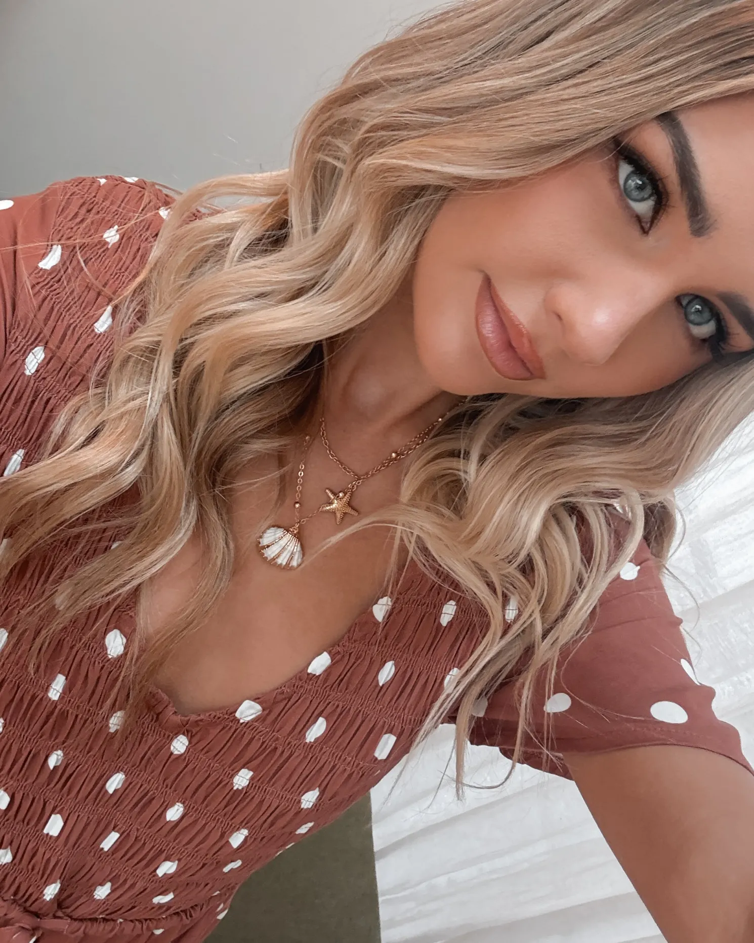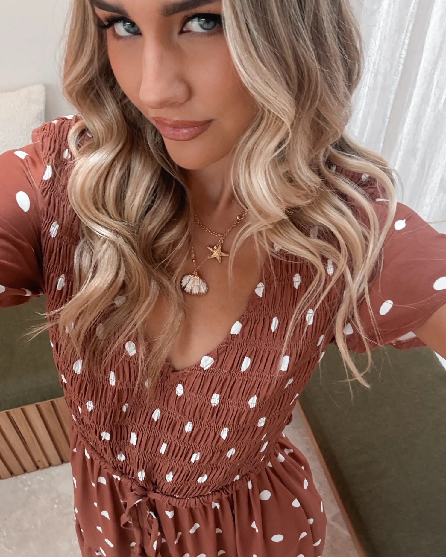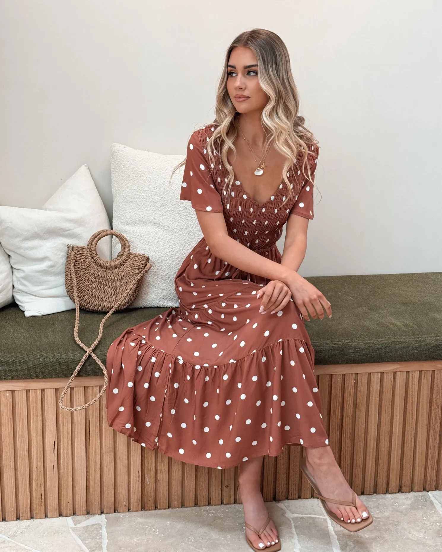 Our Pauletta Dress comes in a rust base with white spot prints. Make dressing up a breeze with this number that features a v-neckline, short flutter sleeves, smocked bodice, waist tie, flowy tiered skirt and midaxi length hem. Style it with woven slides and a raffia clutch for that effortlessly chic ensemble!
