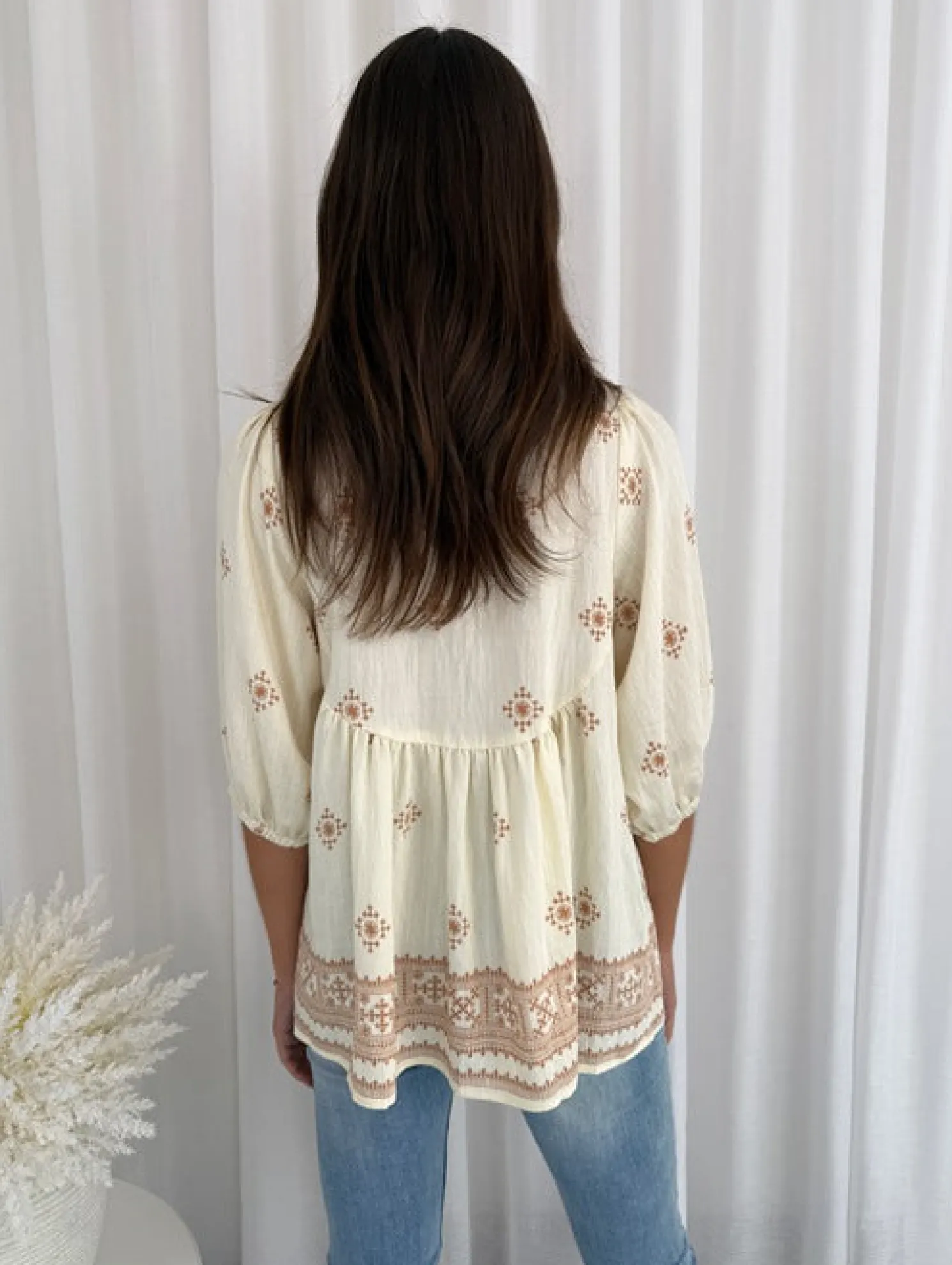 Our Perilla Blouse comes in beige and brown colours. An easy nod to boho charm, this top features a collar with v-neckline and string, elbow length sleeves, centre-front buttons and loose silhouette. Pair it with tailored trousers!