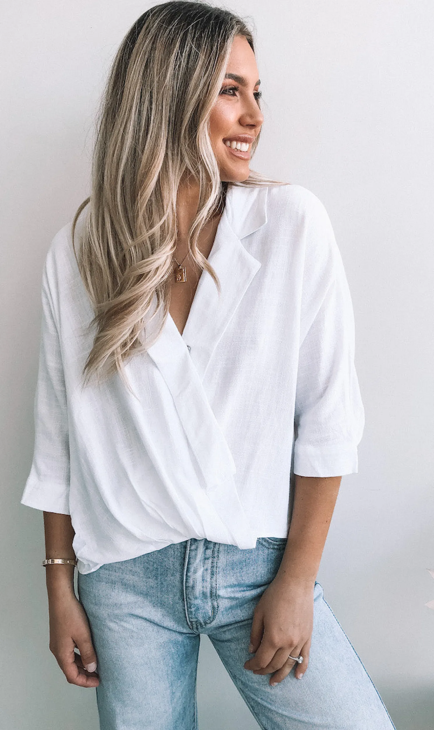 Our Plato Top is your next fave white shirt featuring a twist hemline with a structured collar & relaxed 3/4 sleeves. Pair with your fave denim & gold jewellery for an effortless outfit.