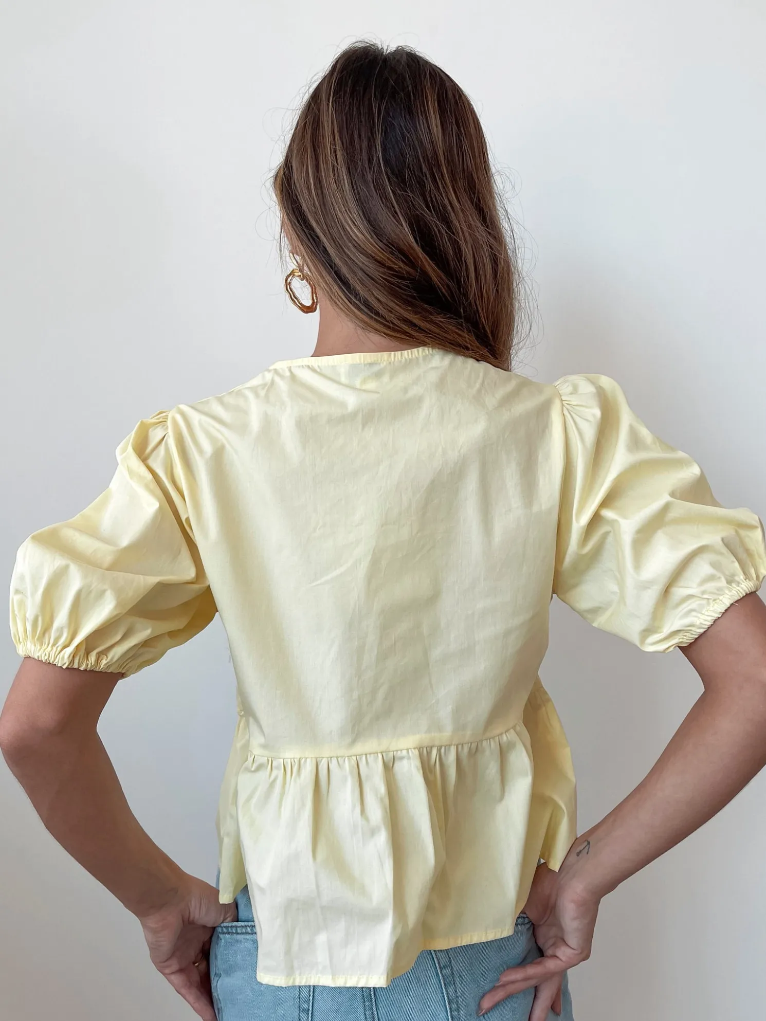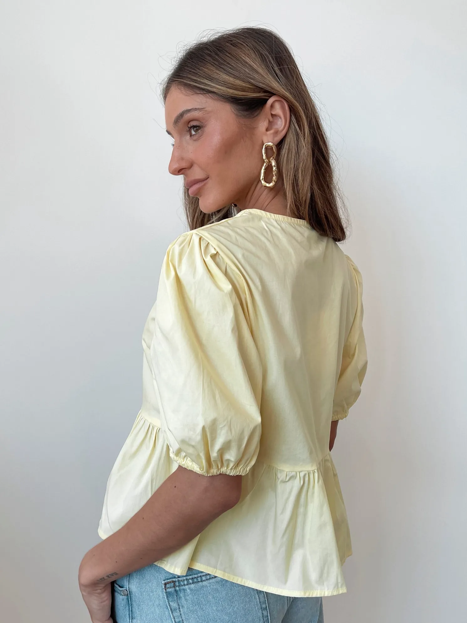 Our Rayanna Top comes in a yellow colour. Wrapping you in a playful charm, this piece features a round neckline, top front bow ties, short puff sleeves and peplum design. Layer delicate gold necklaces and add a few dainty bracelets for some subtle sparkle!