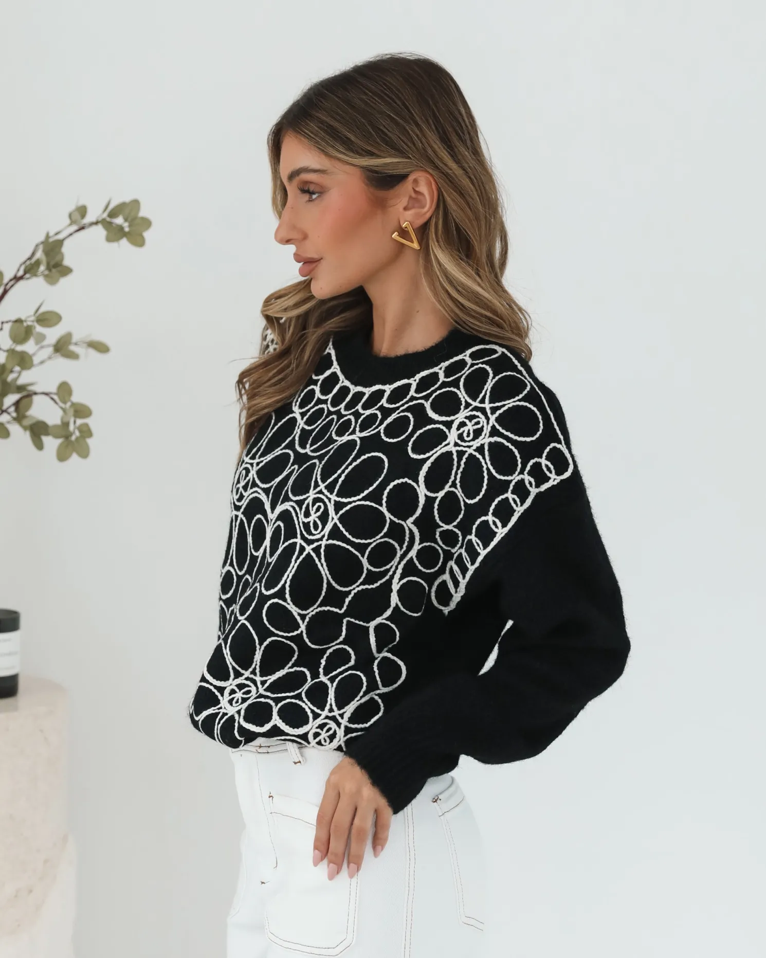 Our Roanne Knit Top comes in black and white tones. Stay stylish while you layer for a cooler weather or dressing up for a coffee date in this jumper that features a round neckline, long sleeves, lovely print and relaxed fit. Wear it with your favourite jeans and sneakers for a casual, laid-back vibe!