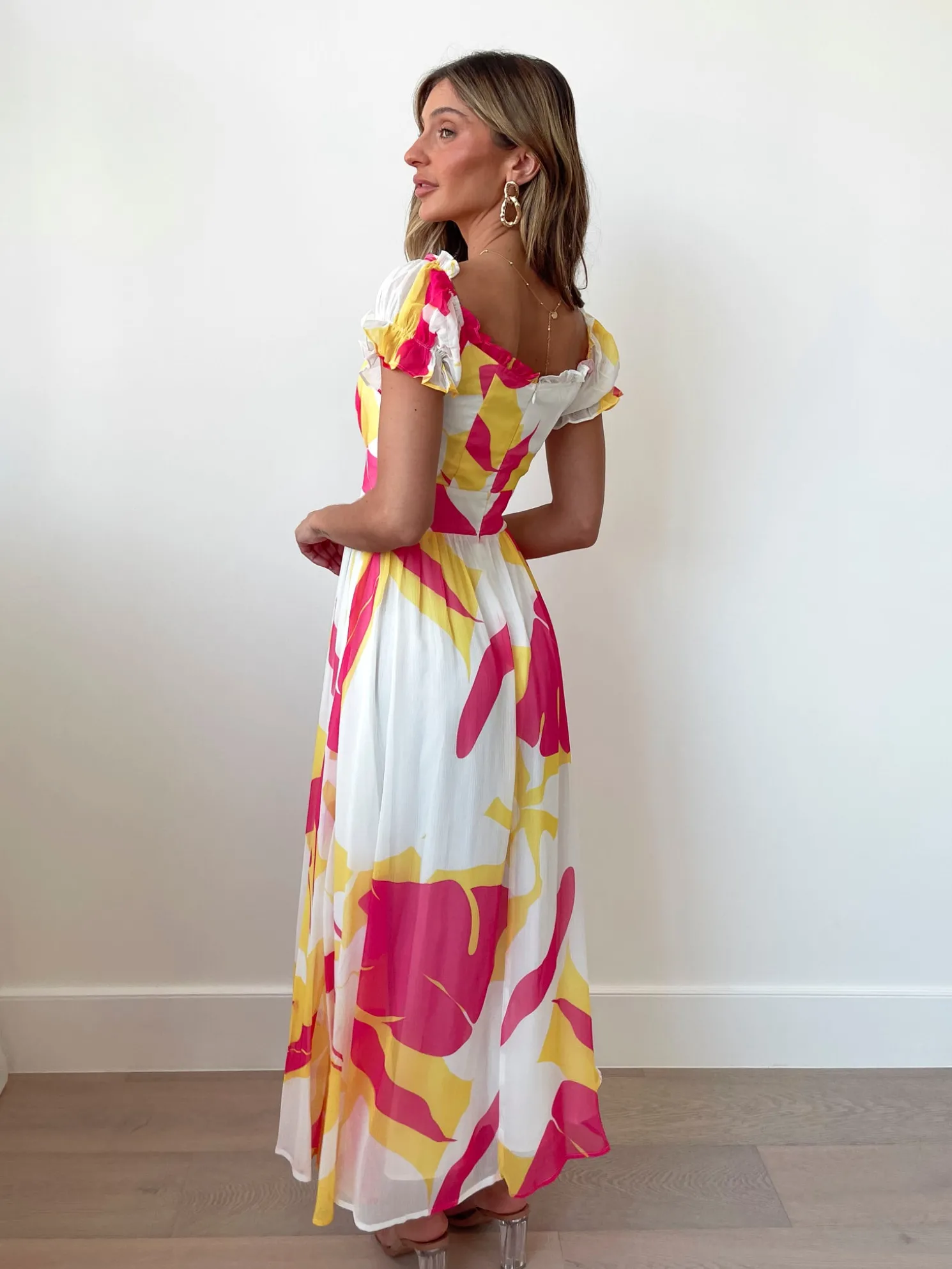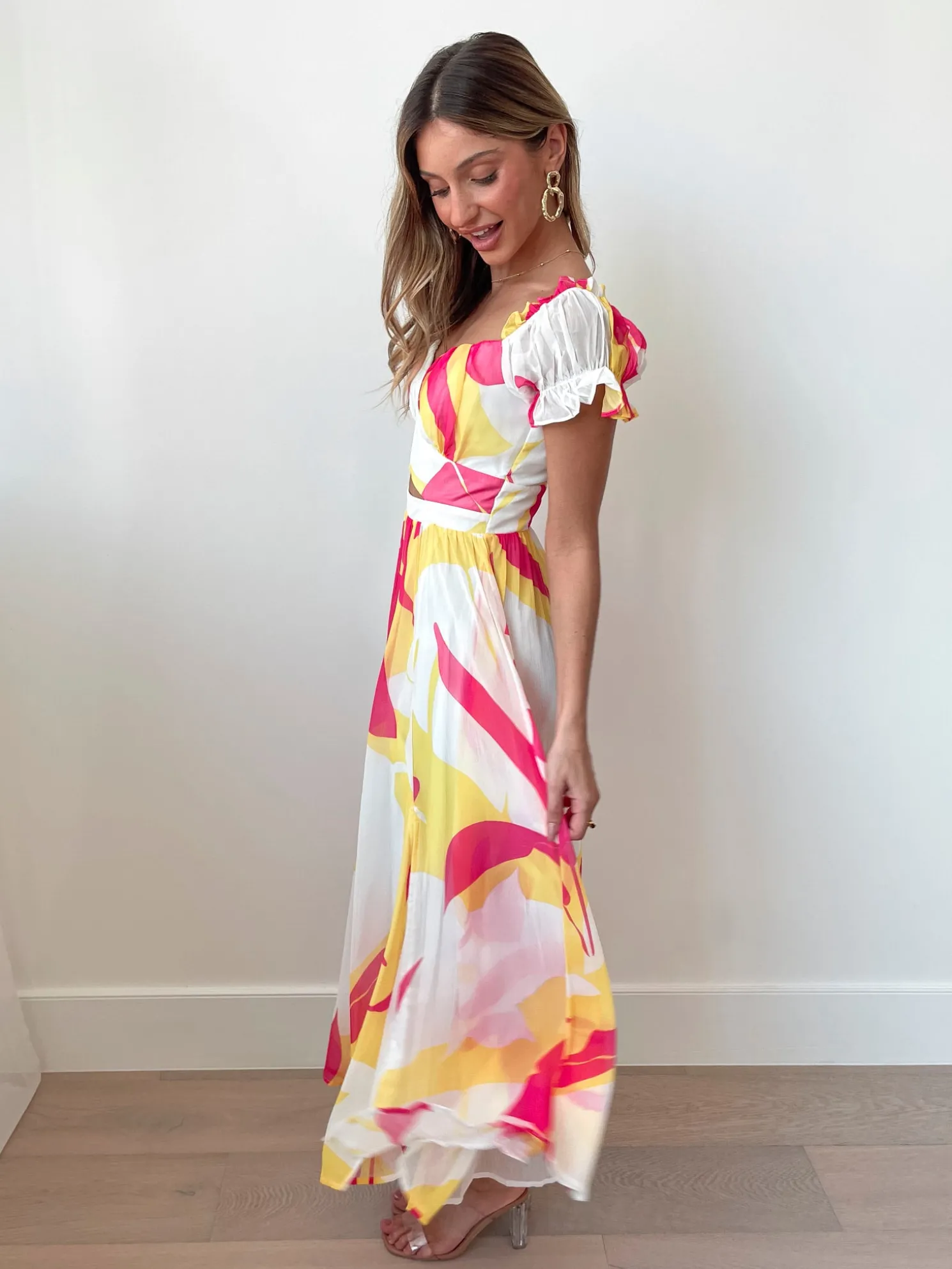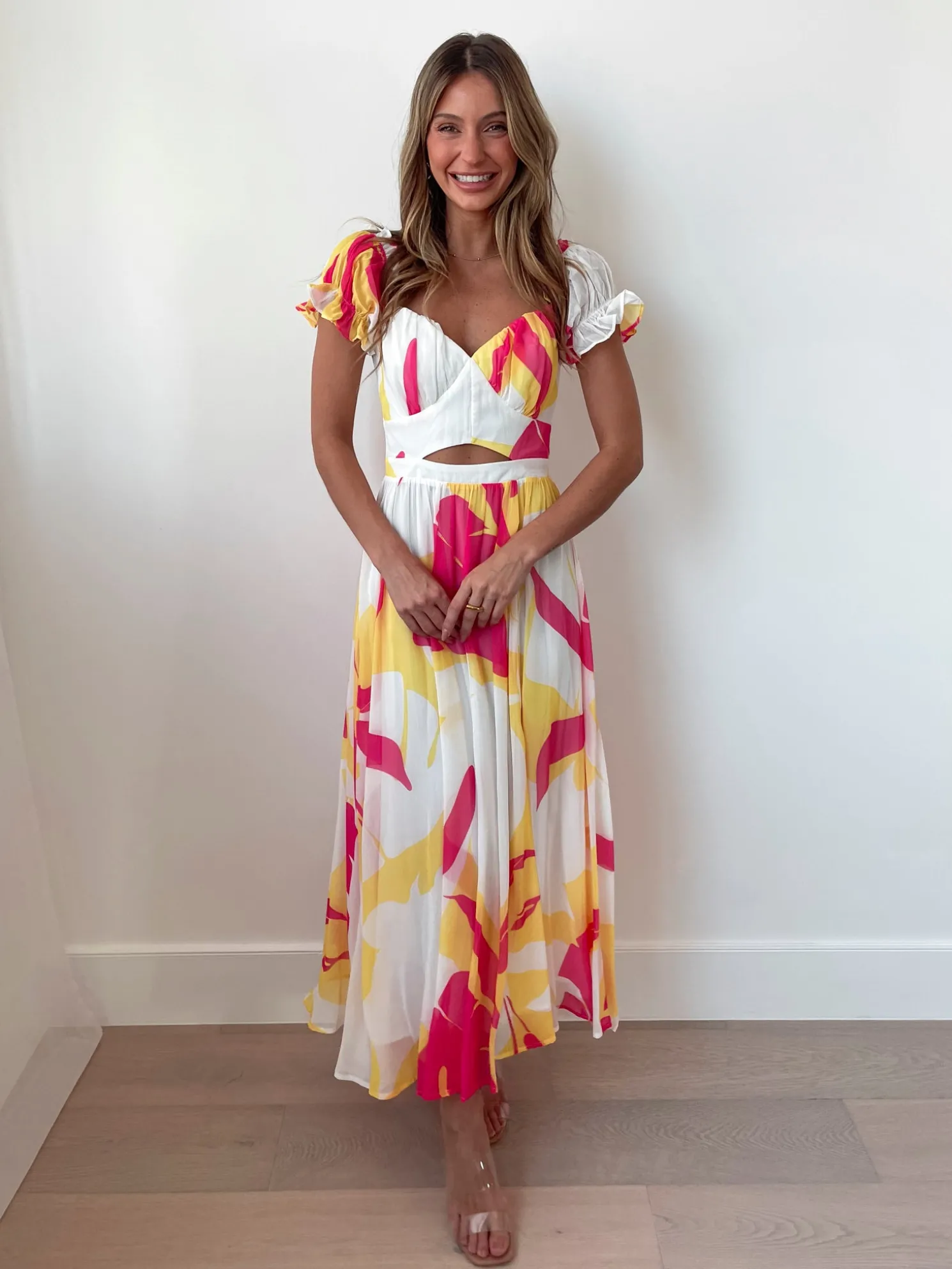 Our Rollene Dress comes in shades of white, yellow and pink. With a stunning blend of colours that feels like a celebration, this piece is designed with a sweetheart neckline, short frilled sleeves, cutout on waist, flowy a-line skirt and maxi length hem. Add a touch of artful flair to your look with bold earrings!