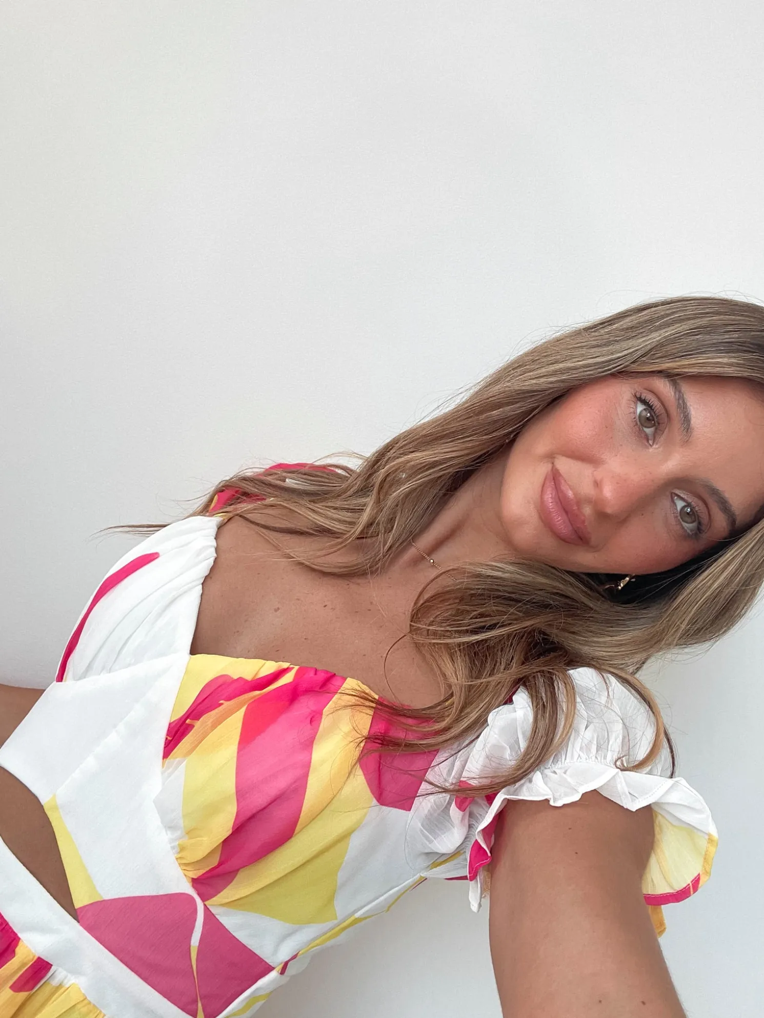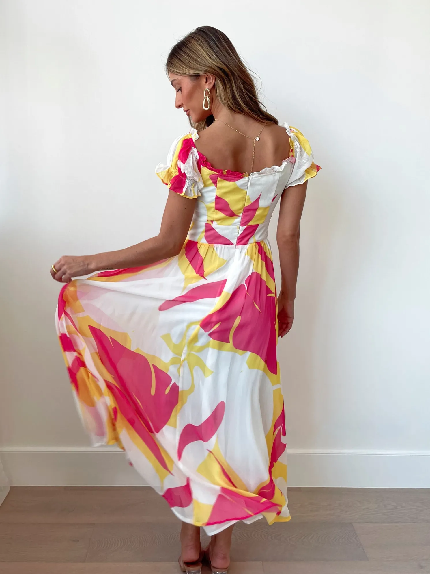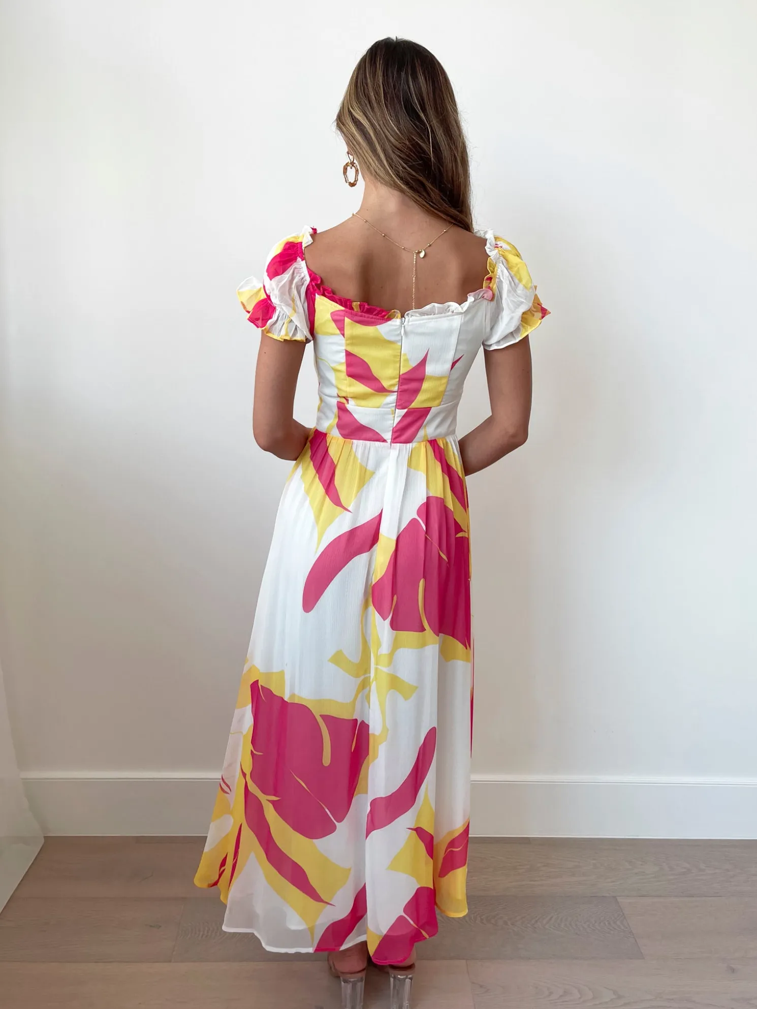 Our Rollene Dress comes in shades of white, yellow and pink. With a stunning blend of colours that feels like a celebration, this piece is designed with a sweetheart neckline, short frilled sleeves, cutout on waist, flowy a-line skirt and maxi length hem. Add a touch of artful flair to your look with bold earrings!