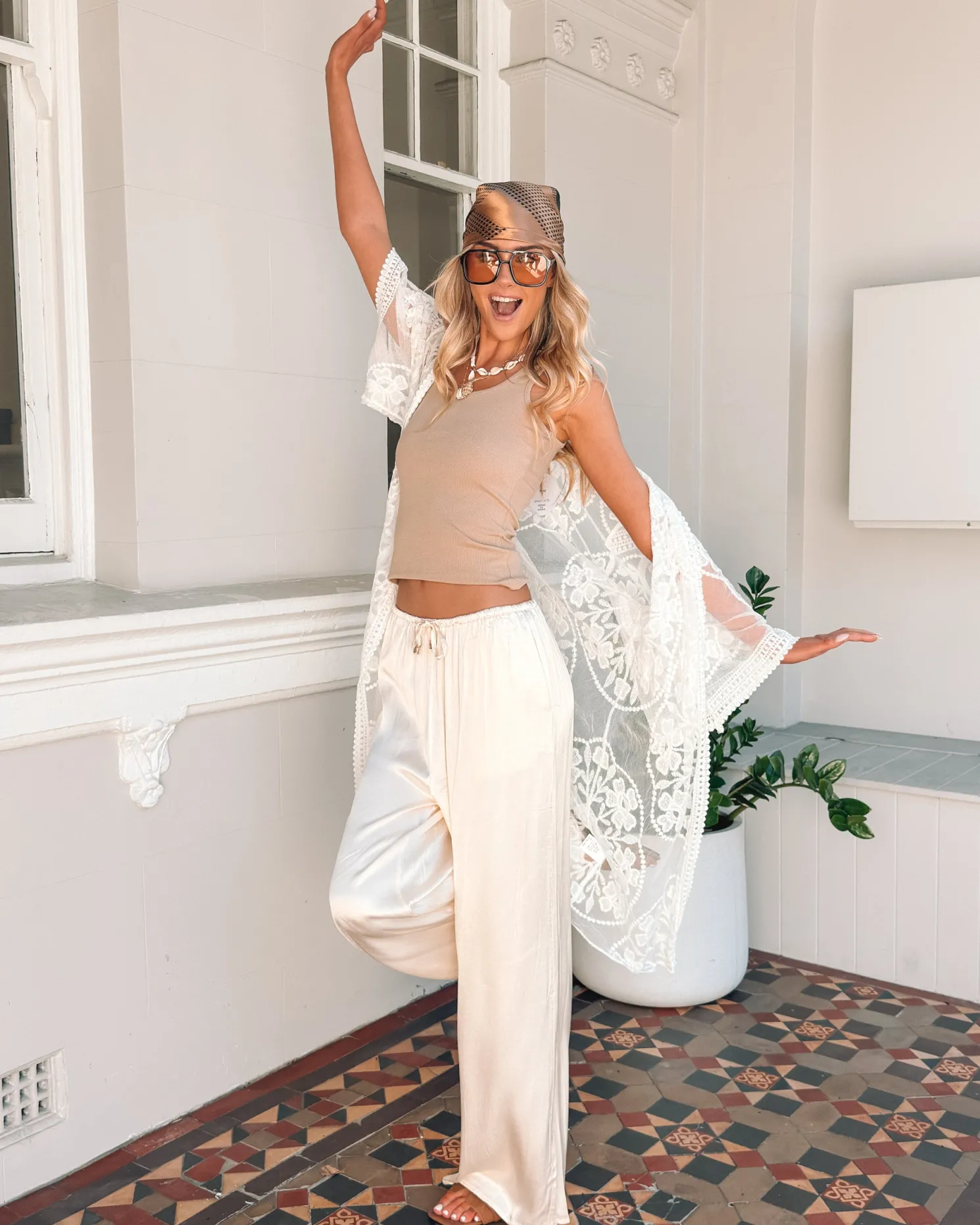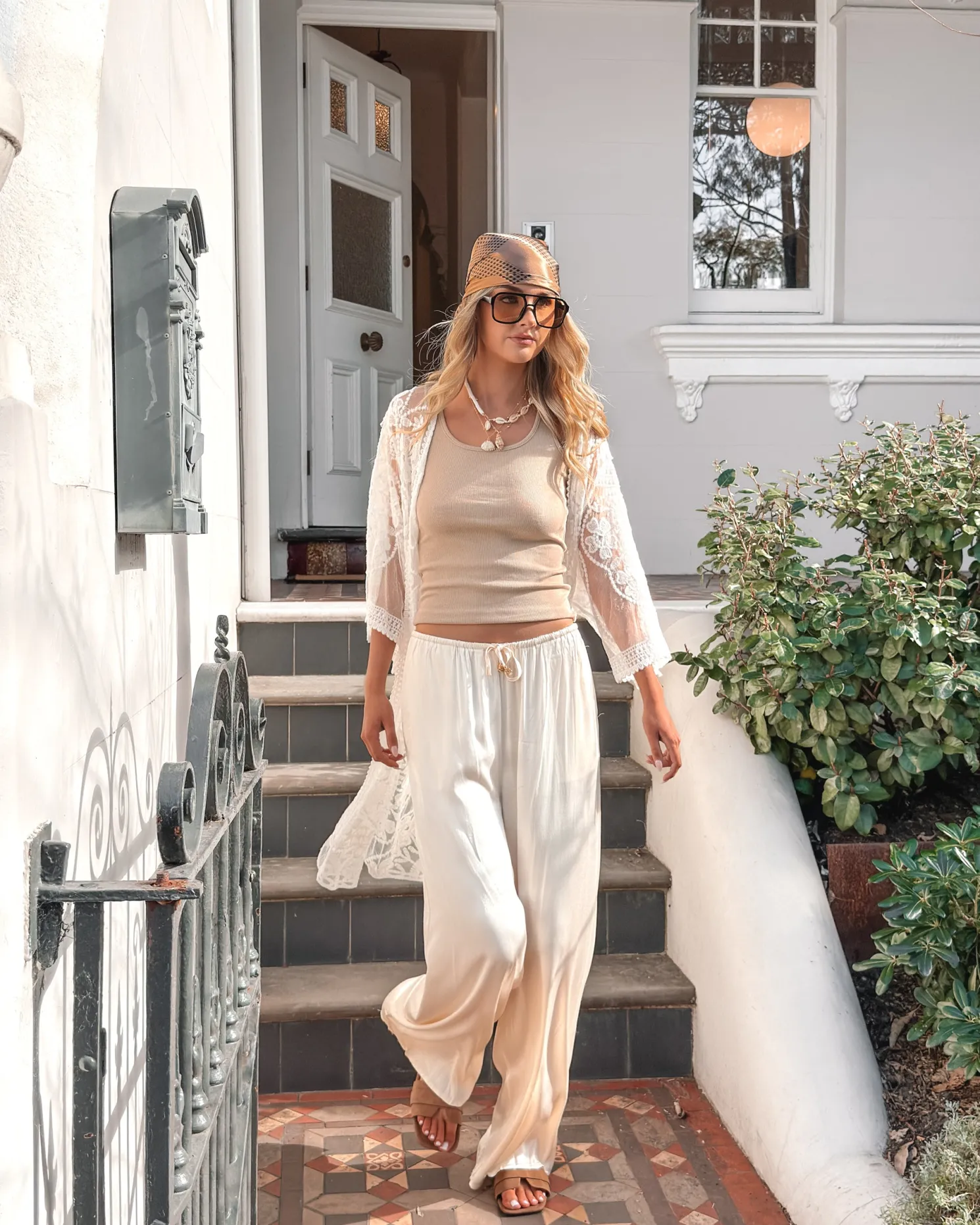 Our Selandra Pants come in a cream colour. A soft power dressing in motion, these bottoms are high waisted and feature a string, side pocket, wide leg silhouette and ankle length hem. For a modern minimalist look, style with a crisp white button-up and kitten heels!