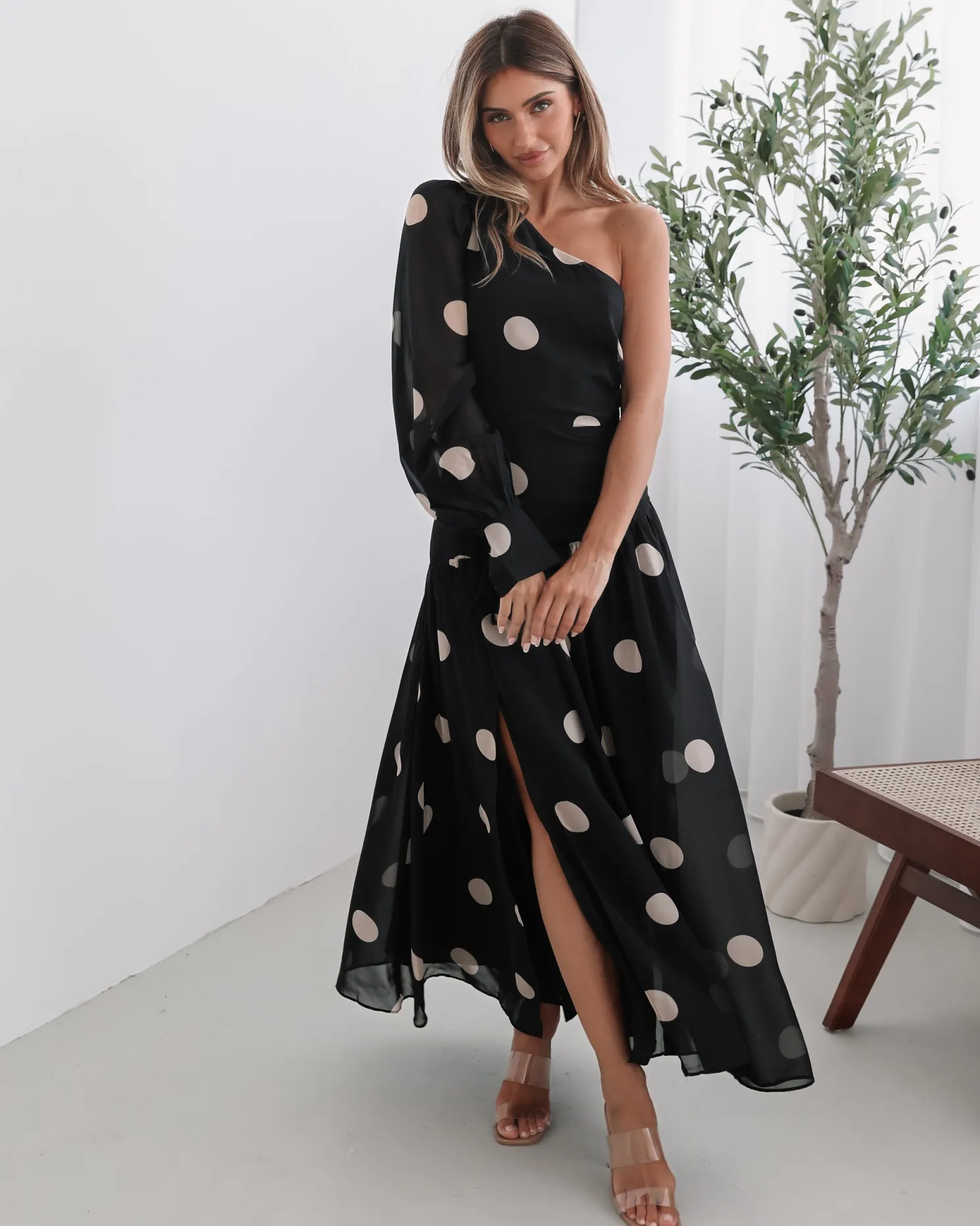 Our Serenella Dress comes in a black base with beige-toned spot prints. A little flirt, a little finesse this number is designed with a one shoulder neckline, single long sleeve, ruching on waist, flowy skirt and maxi length hem. Style it with a structured mini bag to balance the softness!