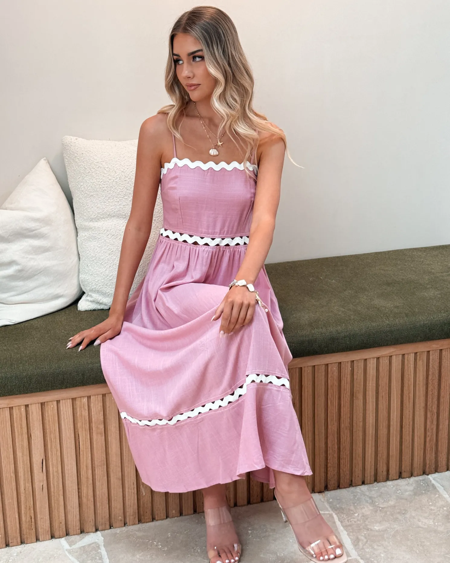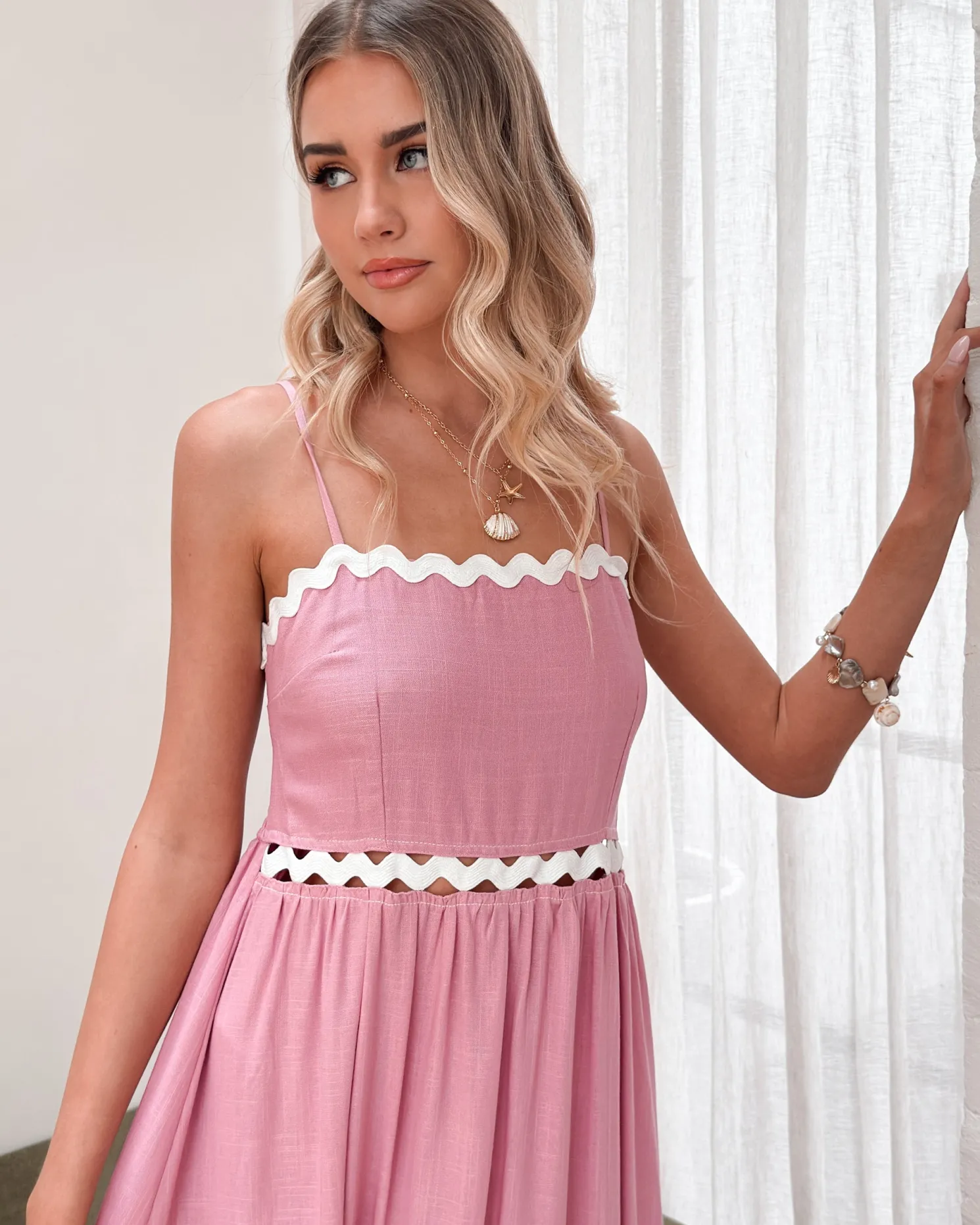 Our Shameeka Dress comes in pink and white tones. Your statement-maker for both brunch and golden hour strolls, this piece is designed with spaghetti straps, square neckline, curve lace inserts, flowy a-line skirt and midaxi length hem. Style it with soft waves on your hair, nude lace-up sandals and a spritz of your signature scent!