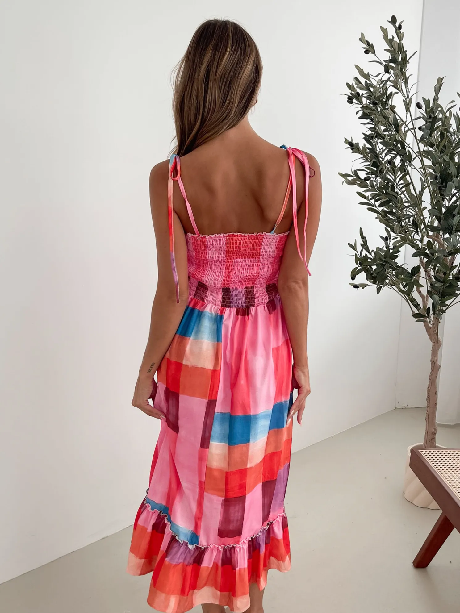 Our Tafoya Dress comes in a multi toned pattern. Crafted with a striking check print in an array of bold, complementary colours, this piece is designed with spaghetti straps, square neckline, smocked bodice, flowy skirt and midi length hem. Pair this statement piece with chunky boots for an edgier look or dress it down with classic flats for a relaxed vibe.