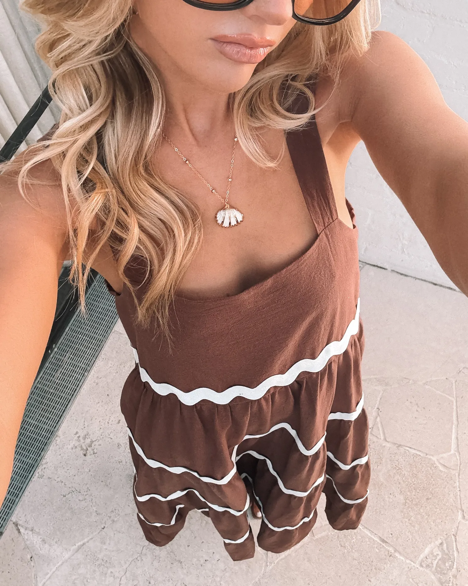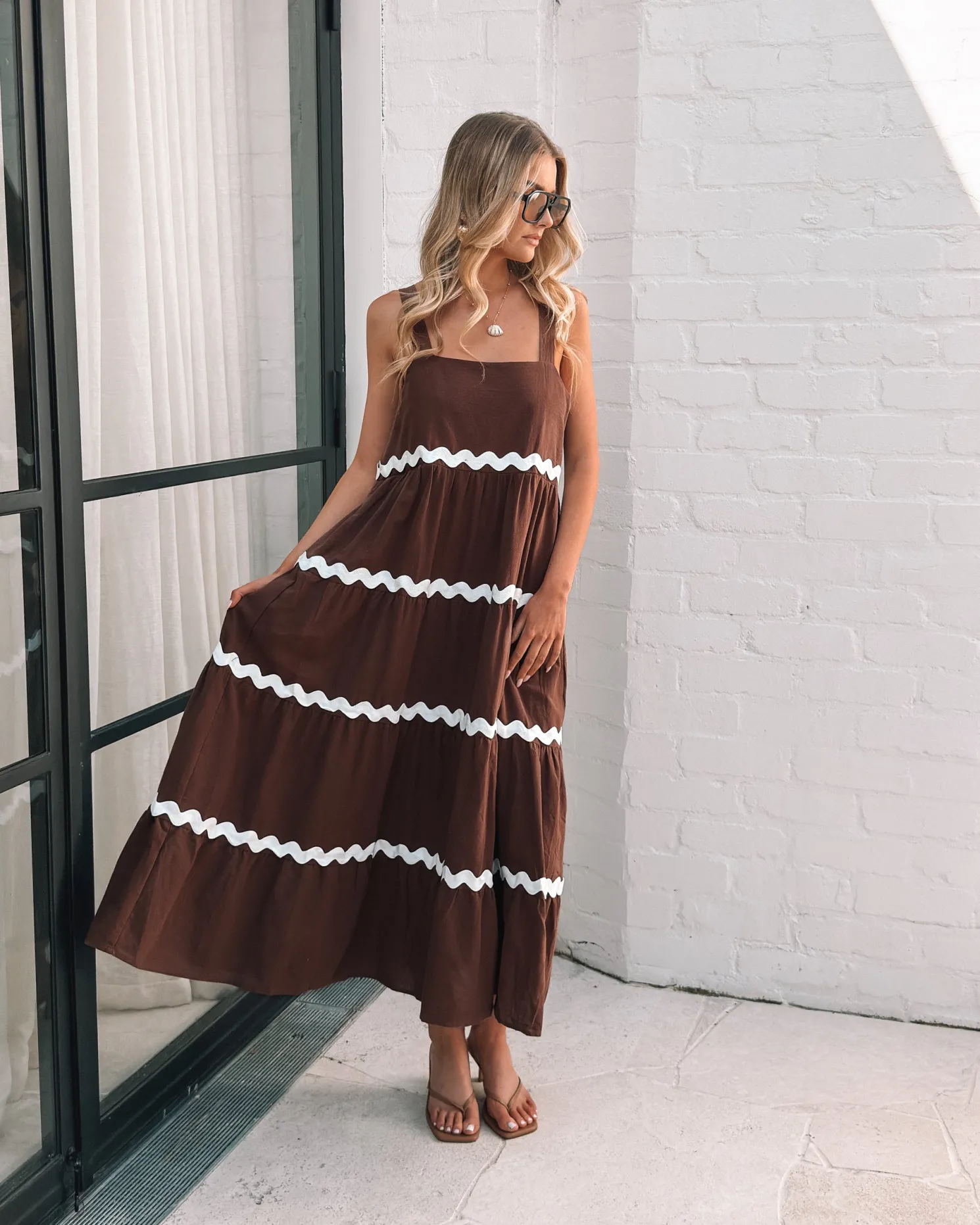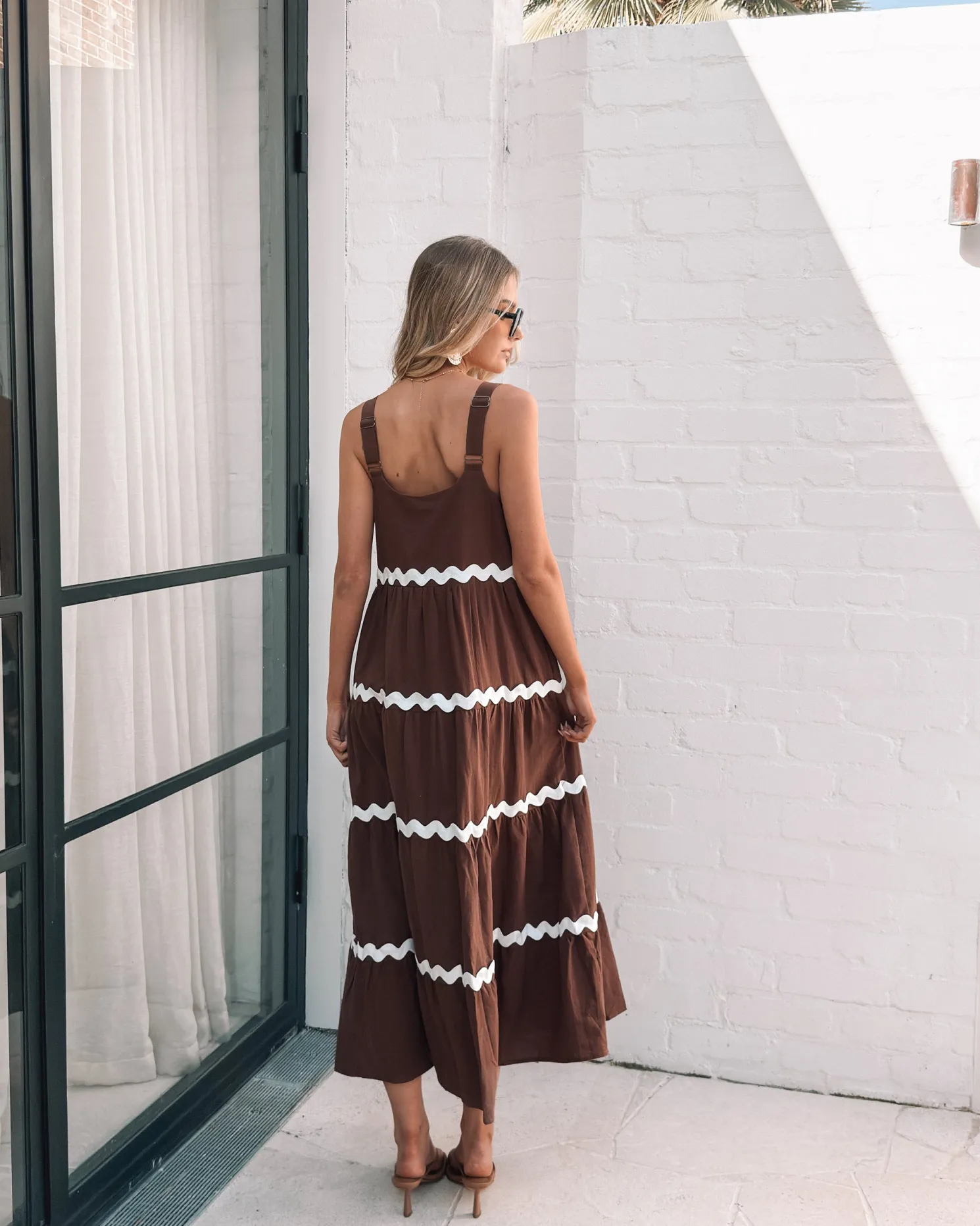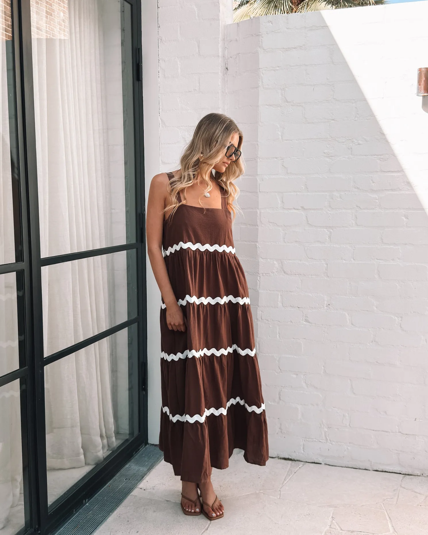 Our Taline Dress comes in shades of brown and white. Flowing beautifully with its relaxed silhouette, wide straps, square neckline and maxi length hem, this piece is perfect for casual outings or sunny adventures. Pair with simple slides, a tote bag, and a sun hat for effortless summer style.