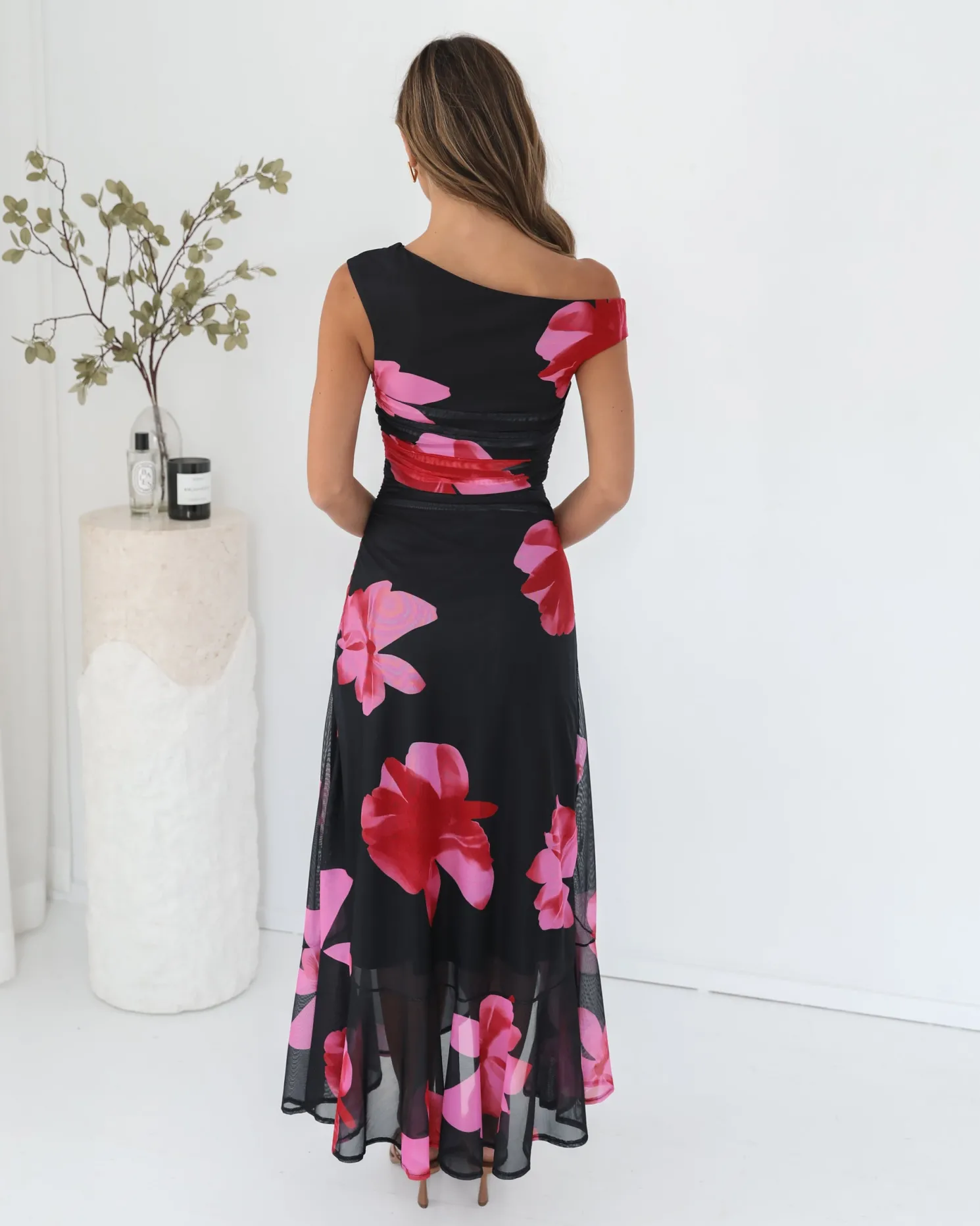 Our Tivara Dress comes in a black base with multicoloured floral prints. Make every step feel like a slow dance with this gorgeous piece that features an asymmetric neckline, ruching on bodice, ruffled skirt and maxi length hem. For a dreamy date night glow, style it with pearl accessories!