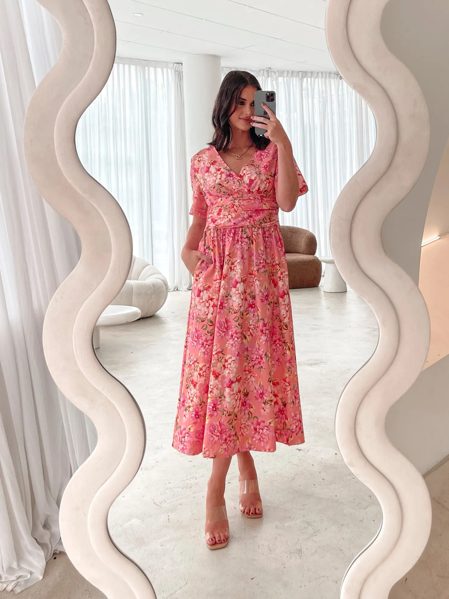 Our Tivona Dress comes in a peach blossom print. Feel glowing all the time in this midi that features a wide v-neckline, short puff sleeves, gathered waist and flowy a-line skirt. Style with block heels and a pendant necklace!