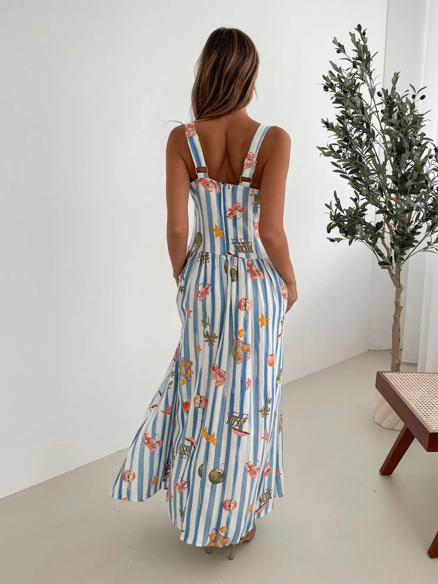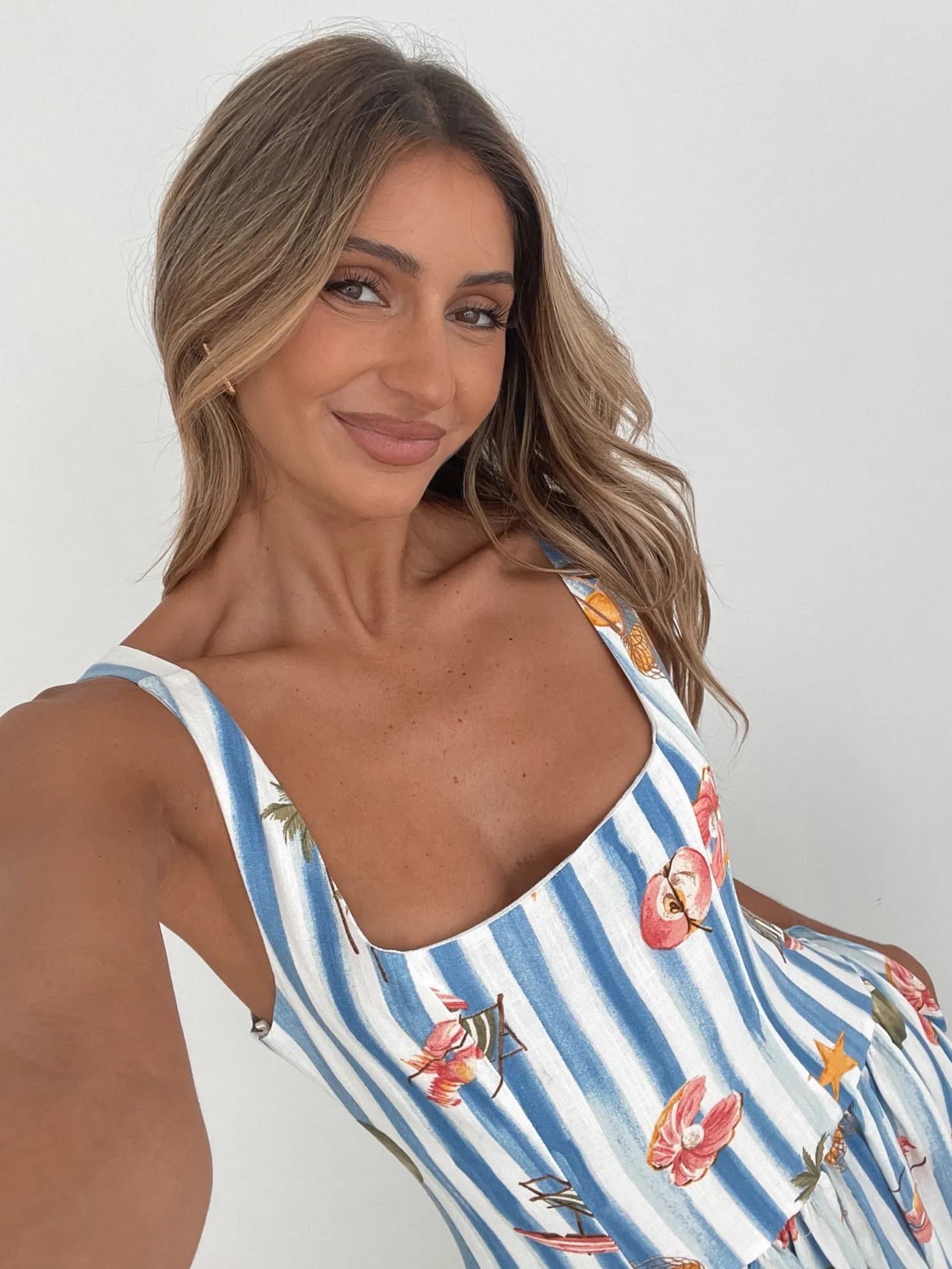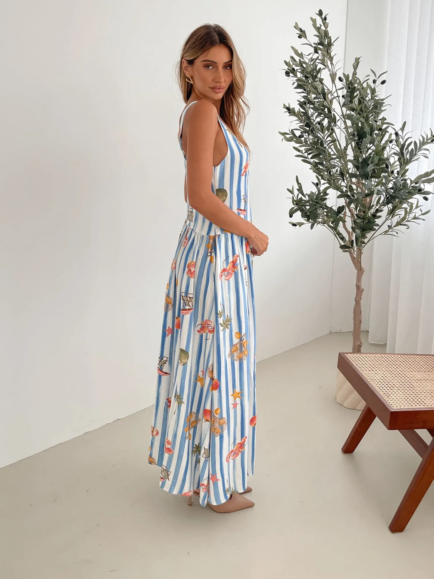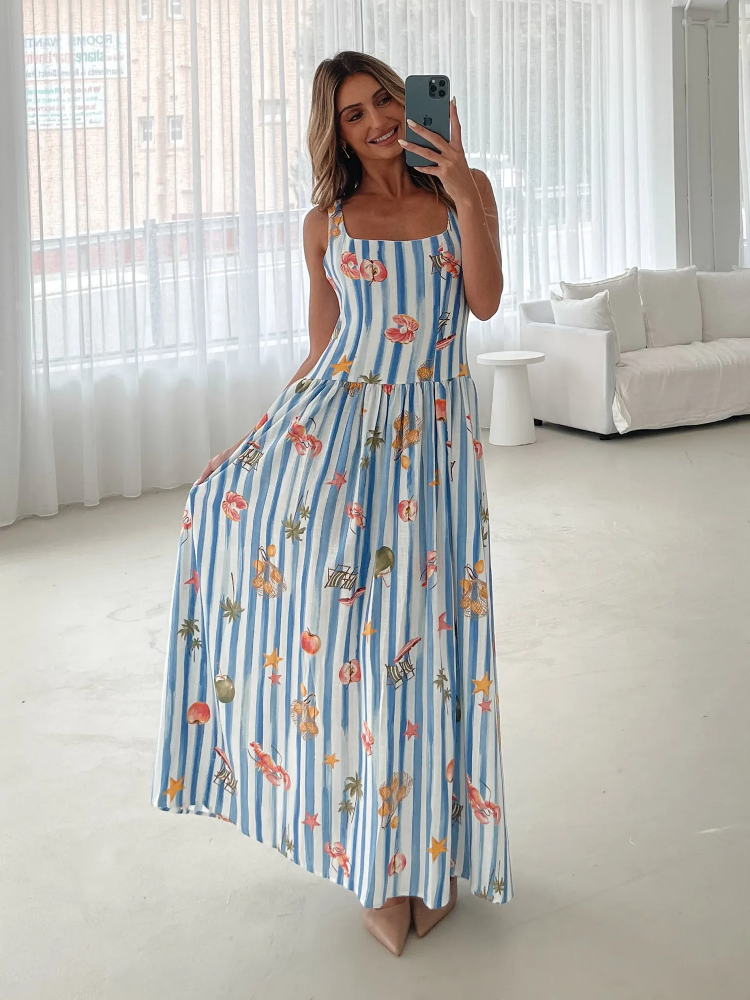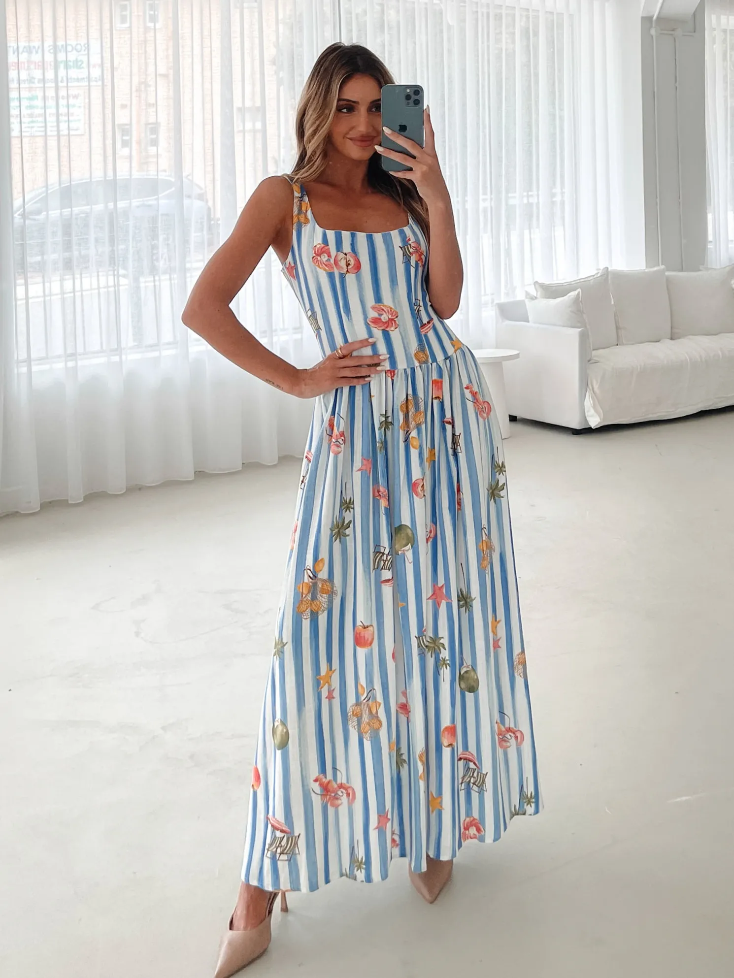 Our Uhura Dress comes in a white and blue base with multicoloured prints. Promises to make a bold statement without saying a word, this piece is designed with wide straps, soft square neckline, flowy skirt and maxi length hem. Transition from a morning seaside stroll to an afternoon tea with ease by adding block heels and dangling earrings!