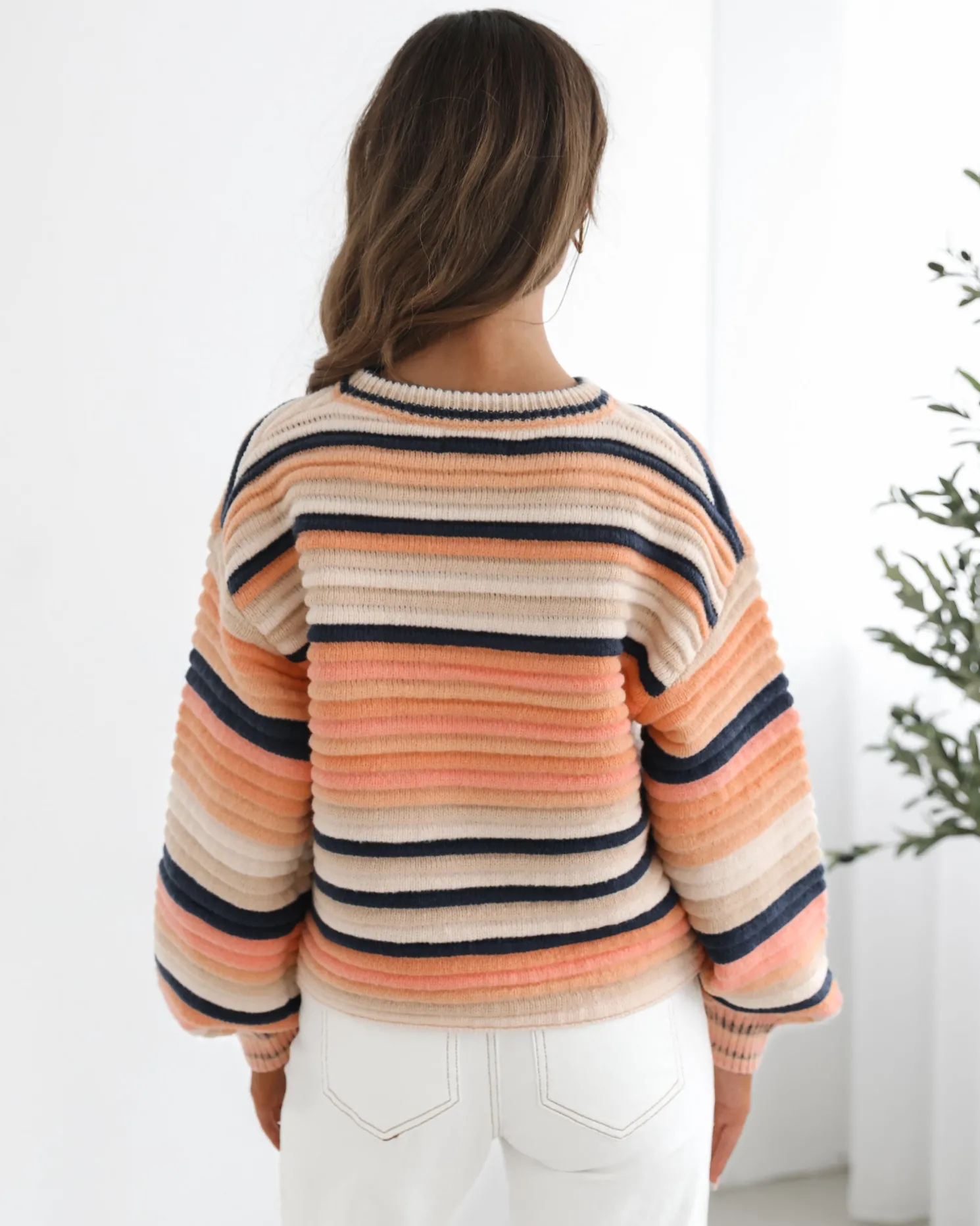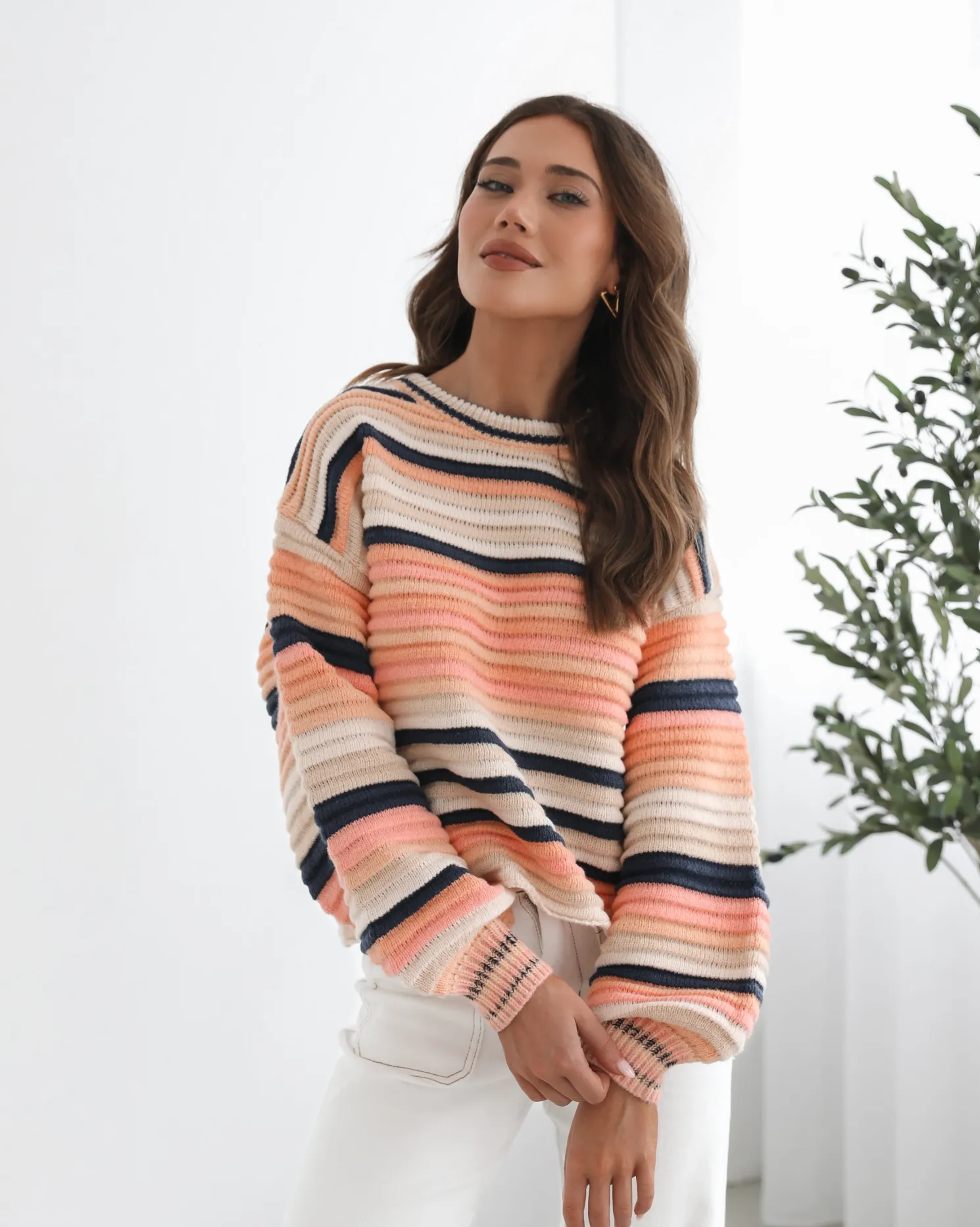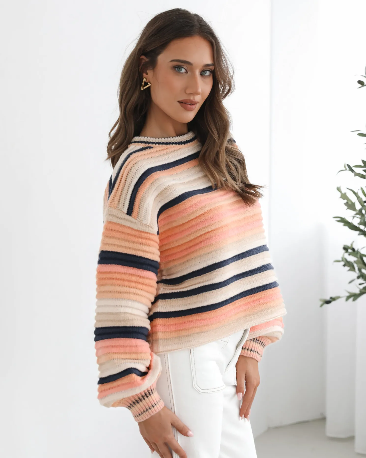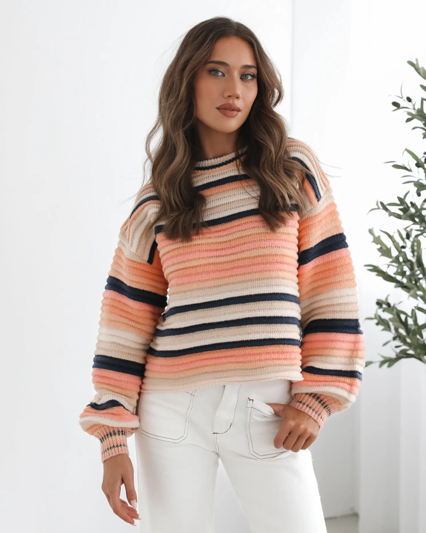 Our Valkyrie Knit comes in shades of pink, brown and blue. A harmonious blend of multi-colored threads, this top is designed with a round neckline, long sleeves and relaxed fit. Style with wide leg pants to look street chic!