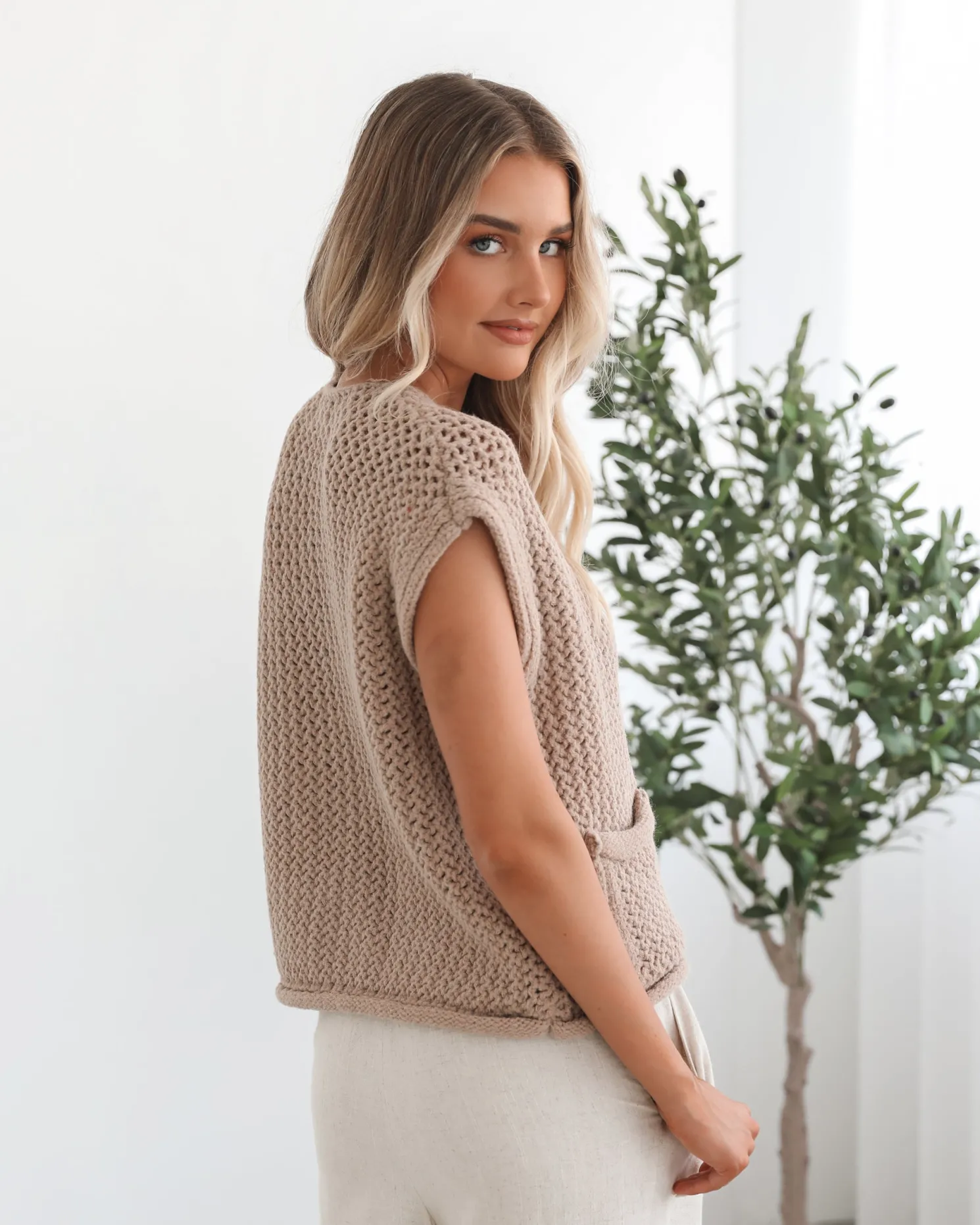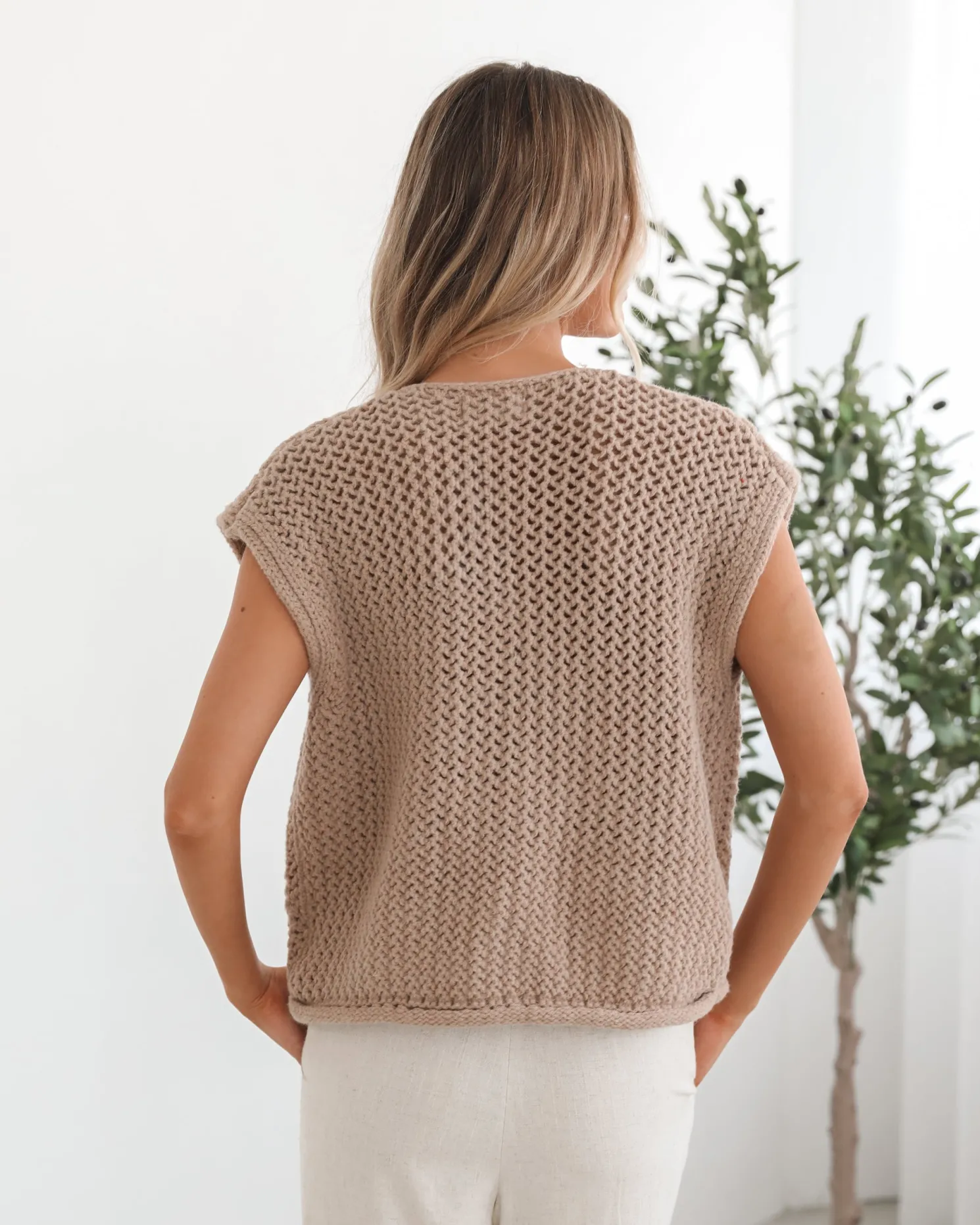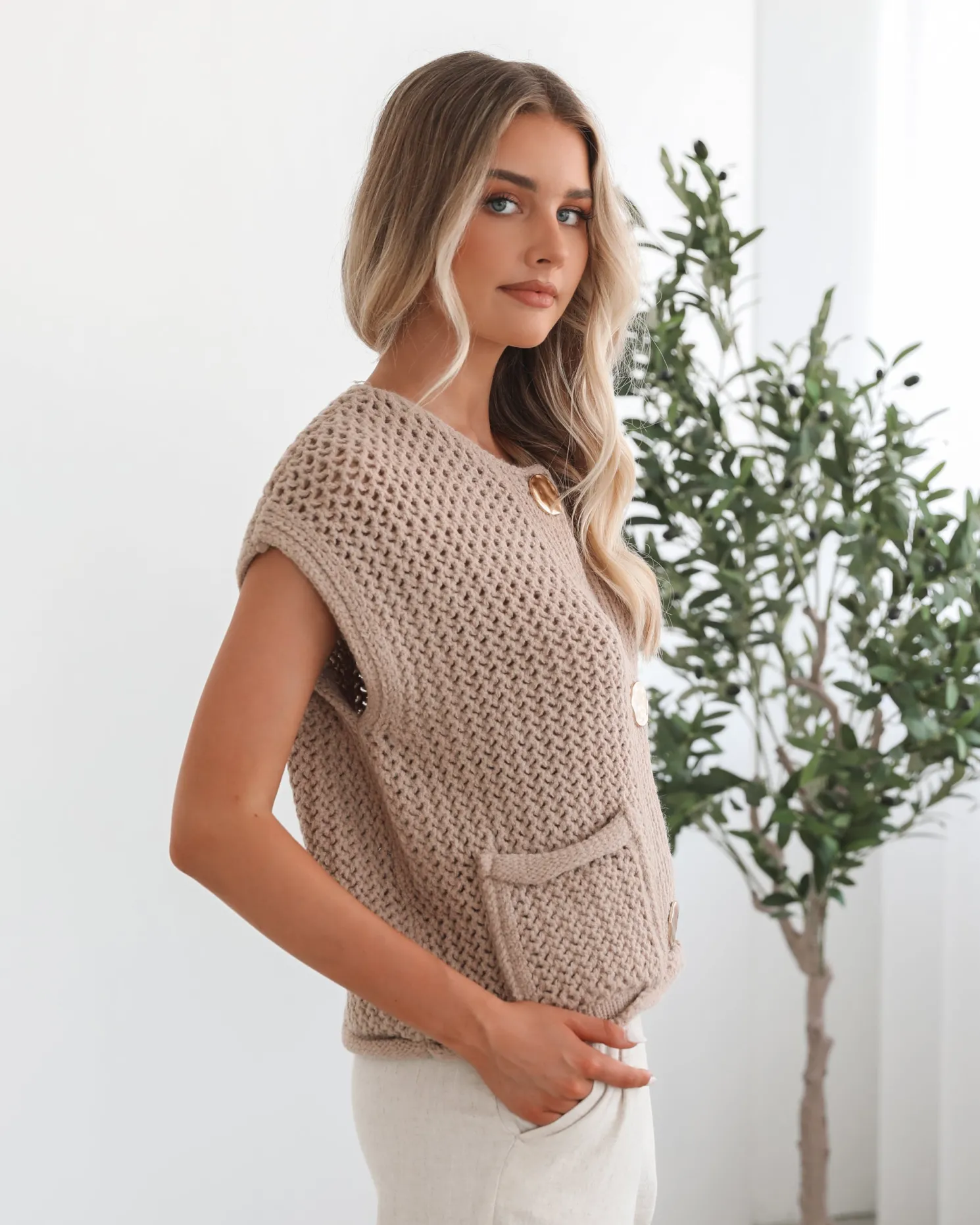 Our Vasha Knit Top comes in a camel colour. A staple that works in every season and can be styled solo or layered for added dimension, this piece is sleeveless and features a round neckline, centre-front buttons and relaxed fit. Wear it with skirt or pants, the choice is yours!