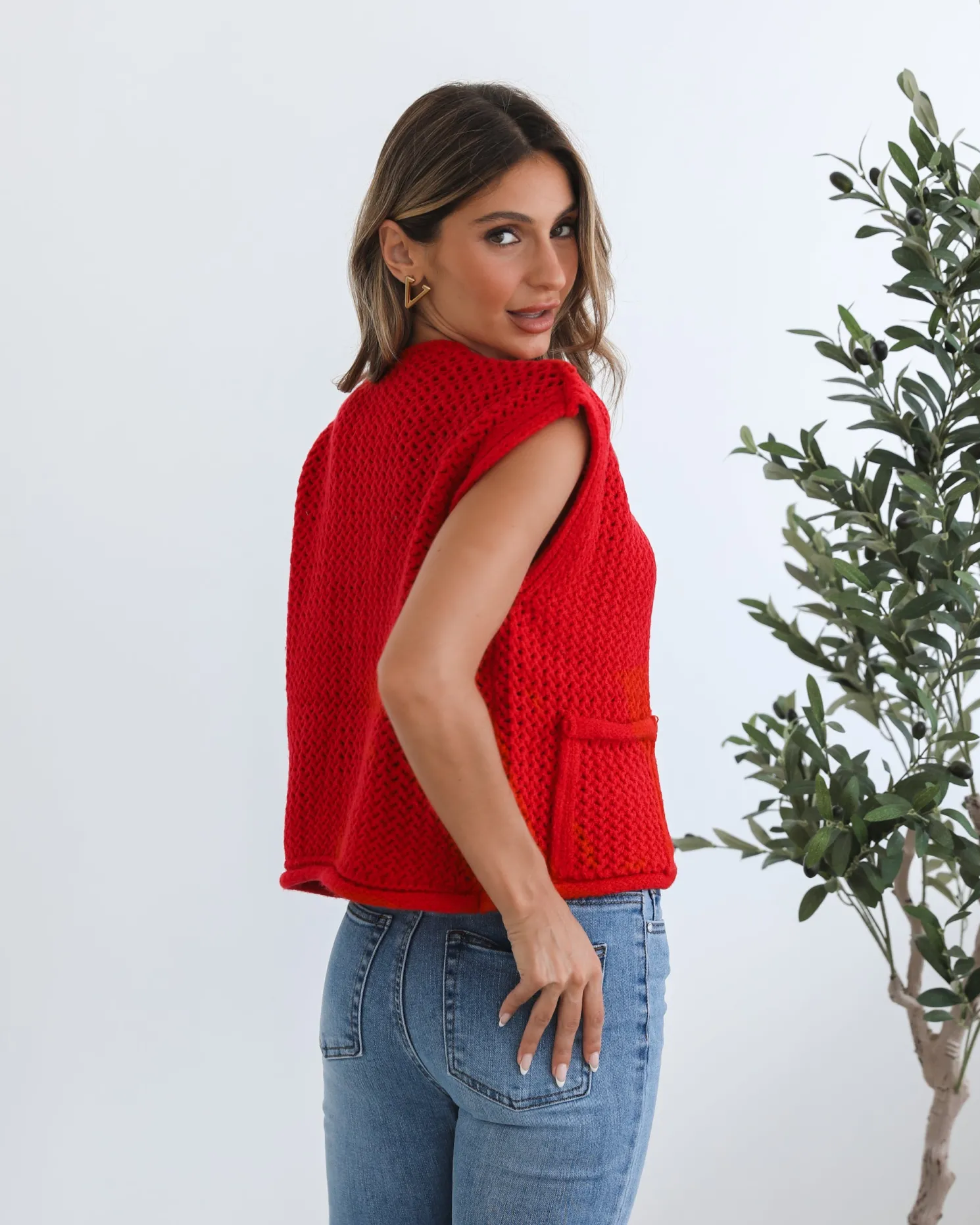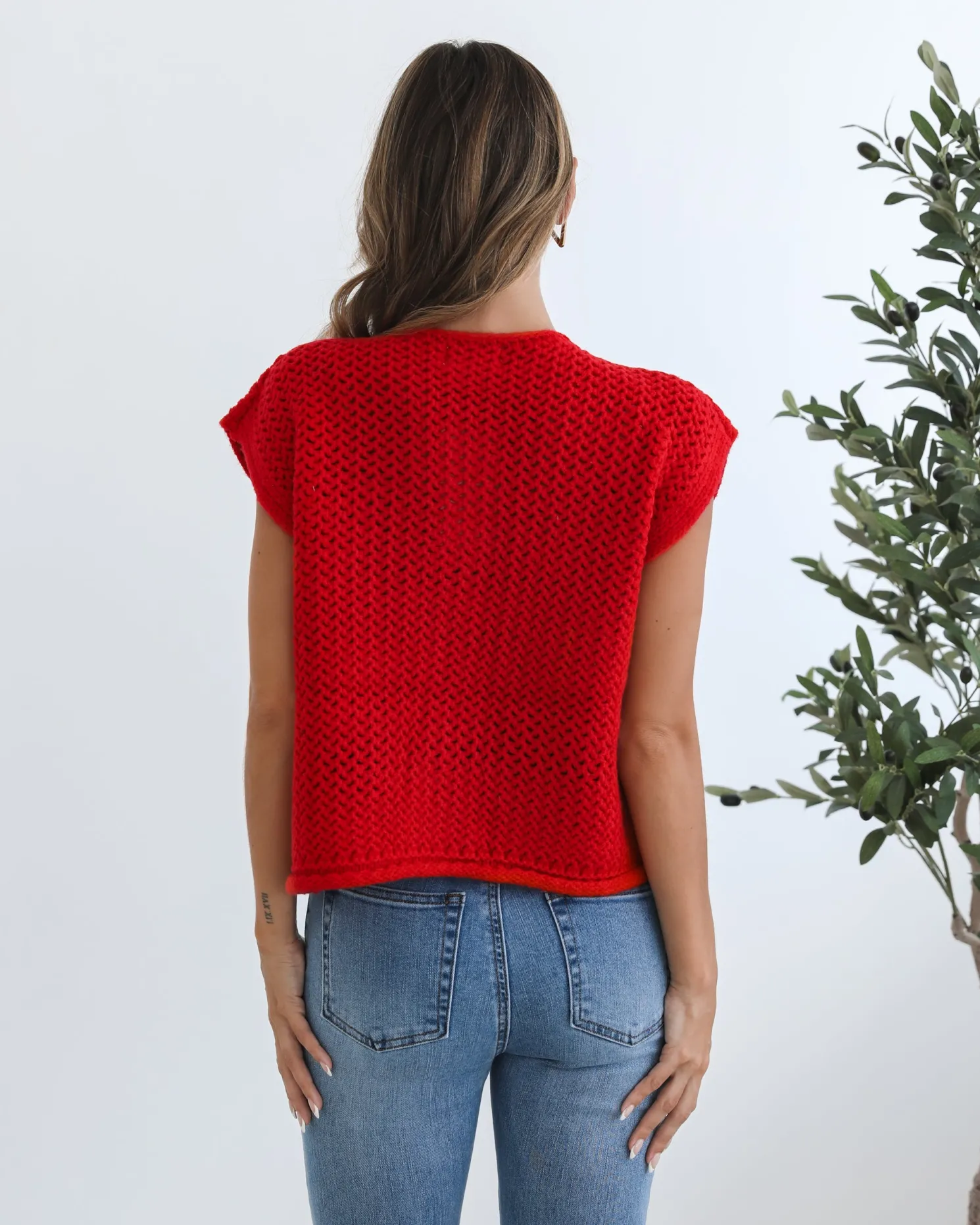 Our Vasha Knit Top comes in a red colour. A staple that works in every season and can be styled solo or layered for added dimension, this piece is sleeveless and features a round neckline, centre-front buttons and relaxed fit. Wear it with skirt or pants, the choice is yours!