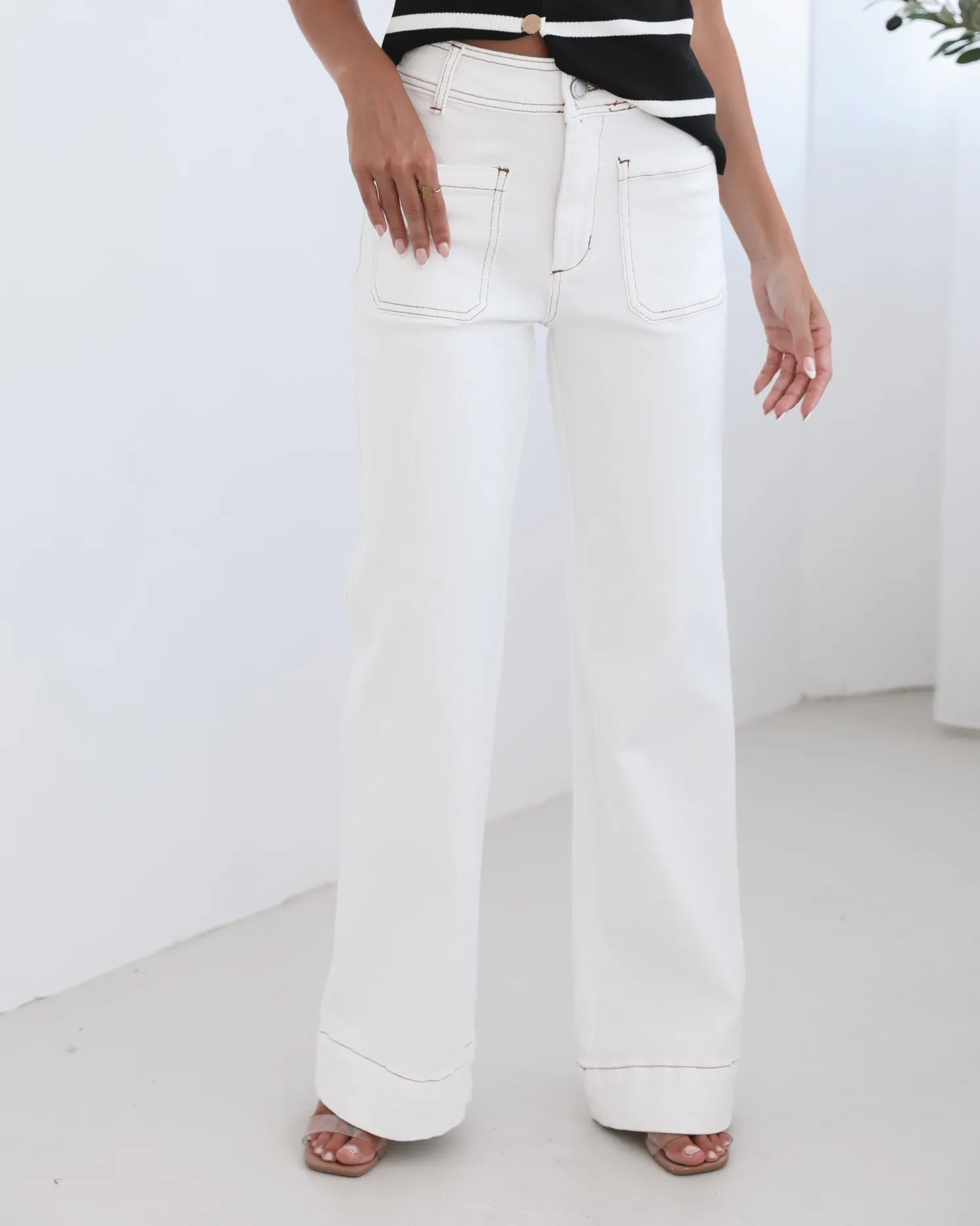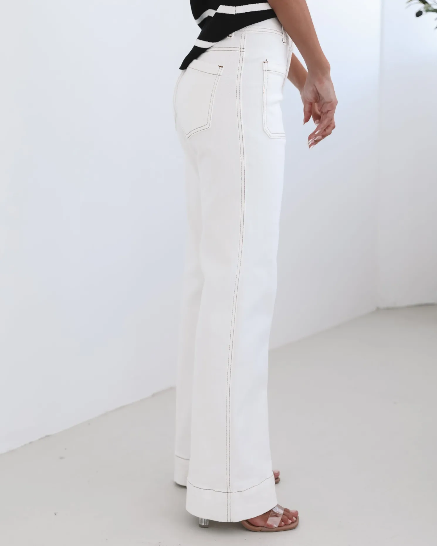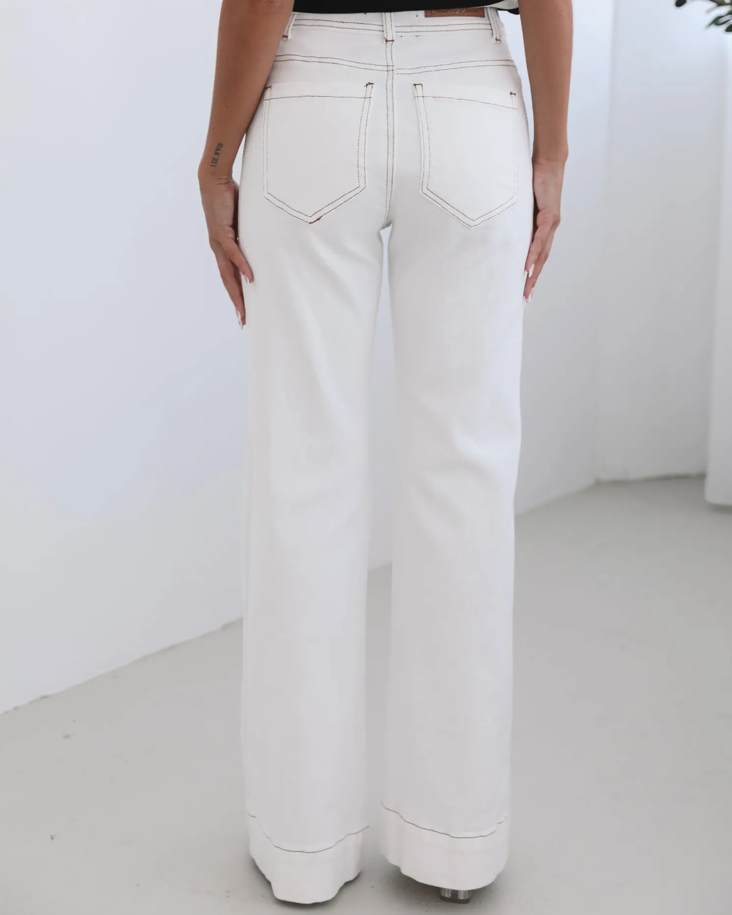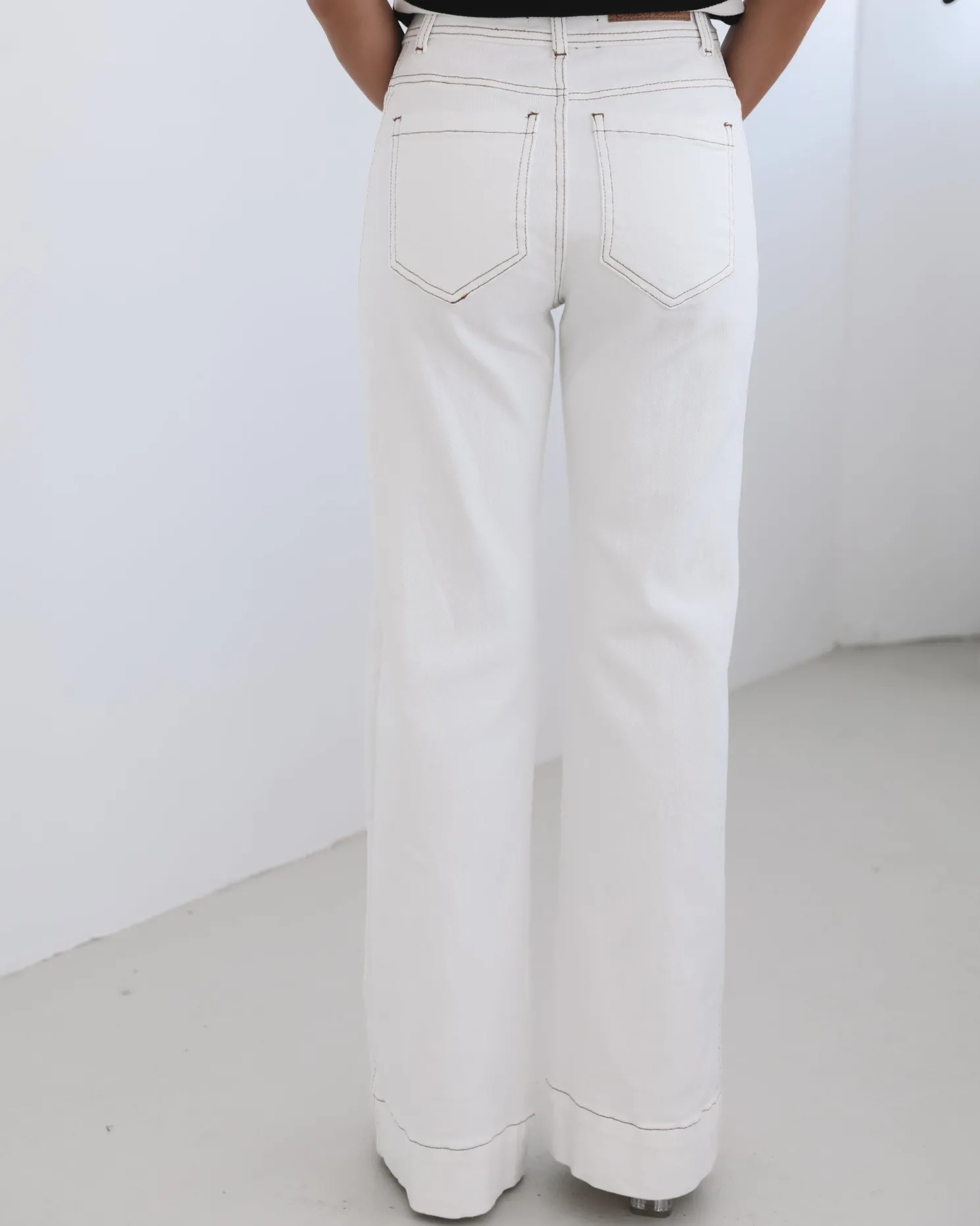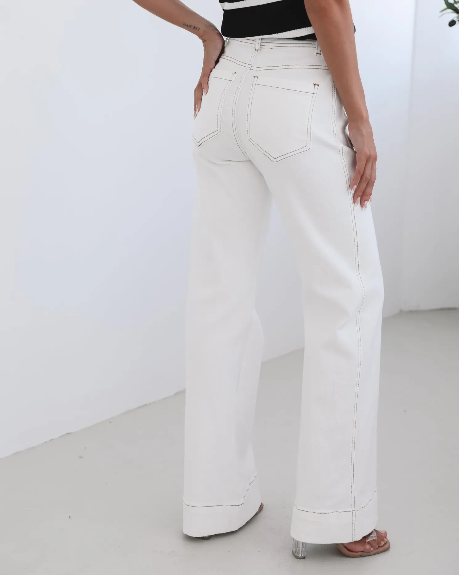 Our Yzabel Jeans come in a white colour with brown contrasting stitches. Add some edge to your look with this piece that features a high waist fit, belt loops, side pockets, button and quarter zip closure and wide leg silhouette. Pair with a knit top and block heels!