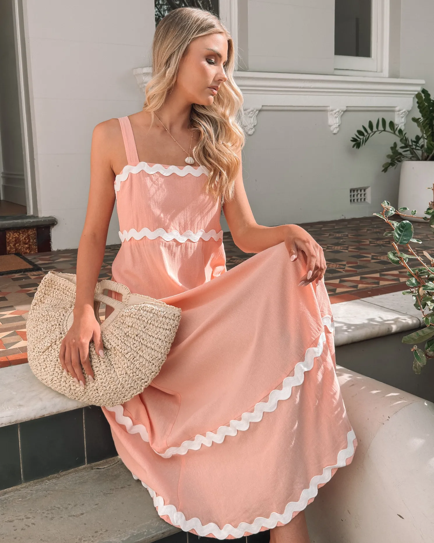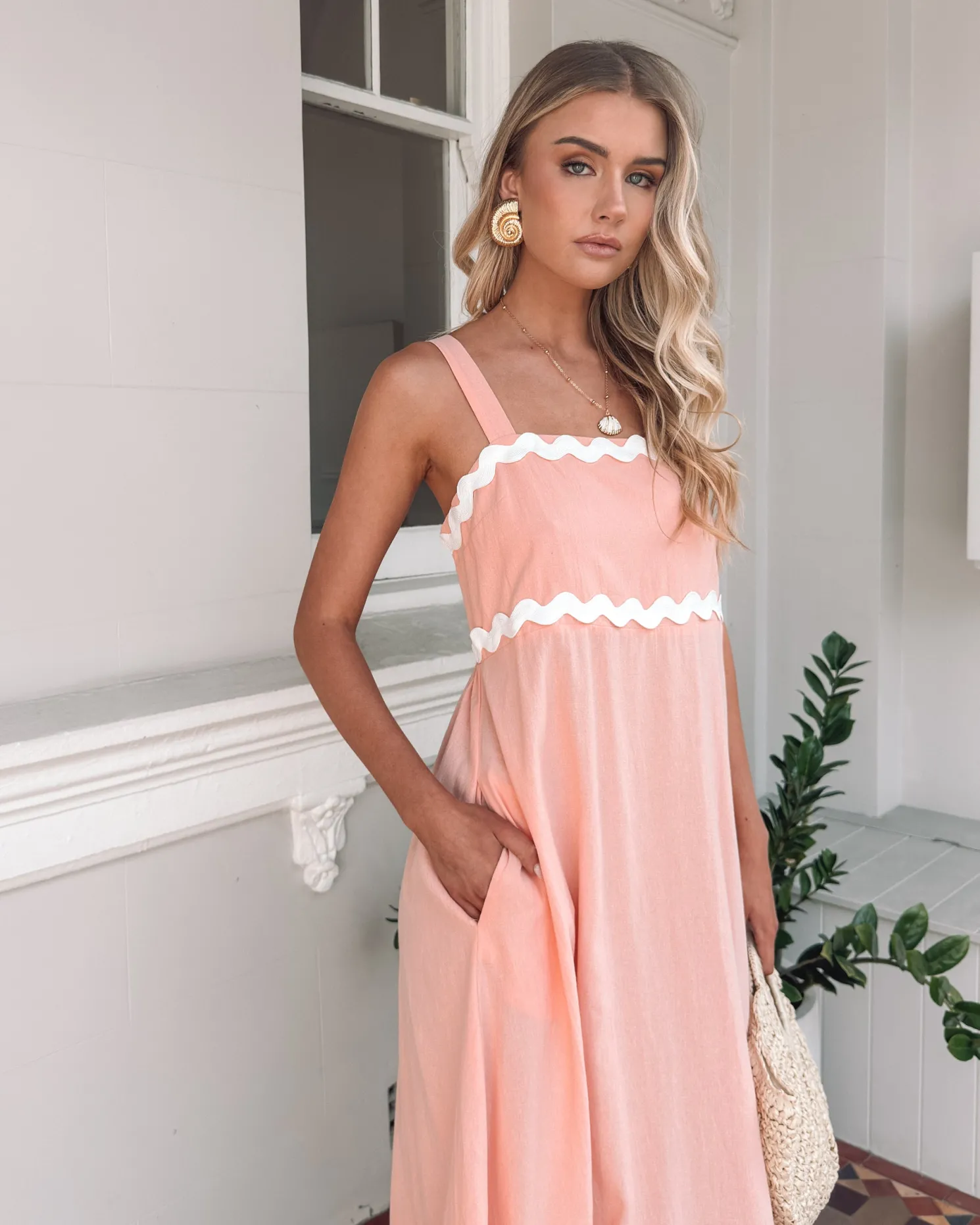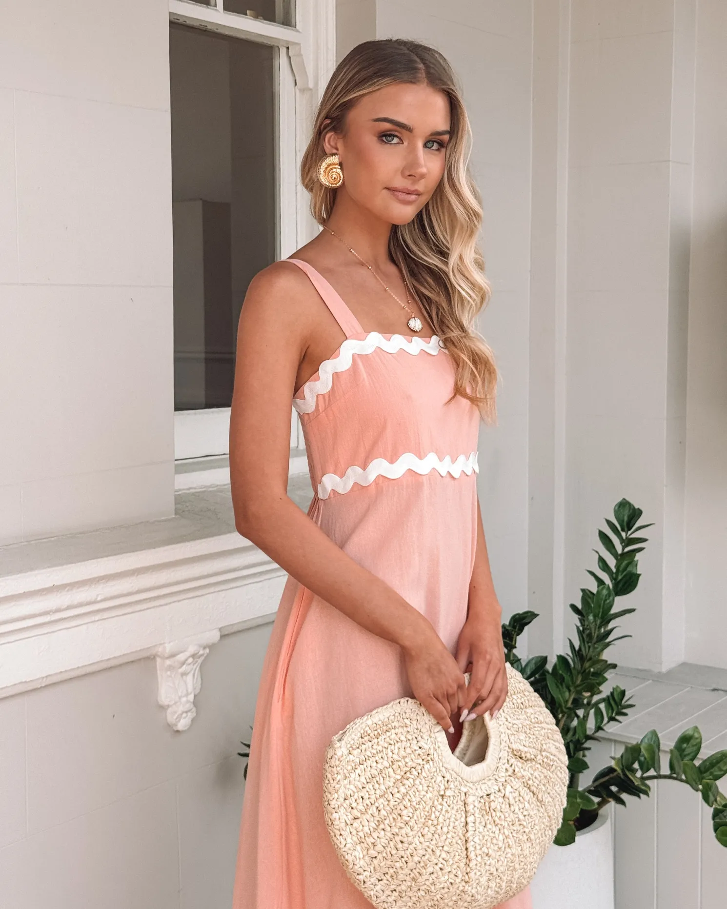 Our Zarienne Dress comes in pink and white tones. A stunning visual that seamlessly blends subtle sophistication with a touch of playful complexity, this piece is designed with straps, square neckline, flowy a-line skirt and midaxi length hem. Style it with a gold pendant necklace!