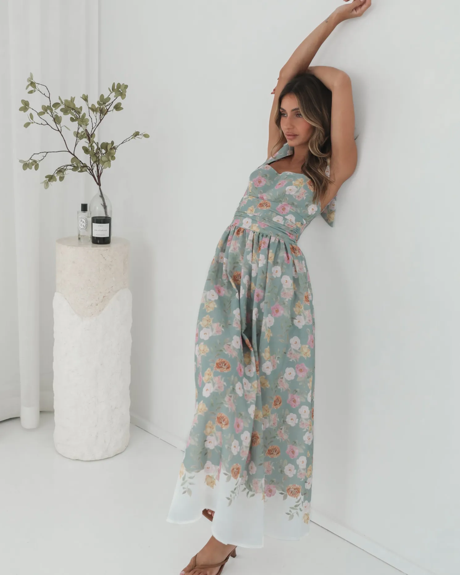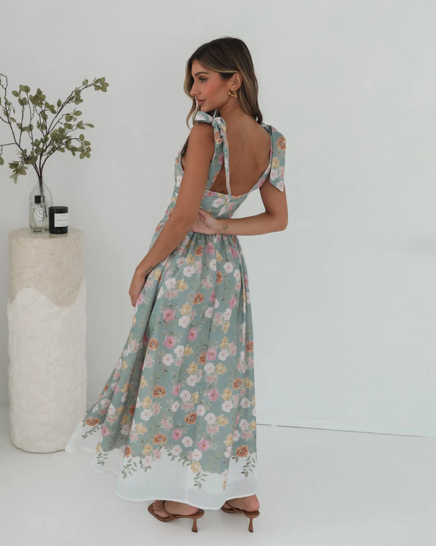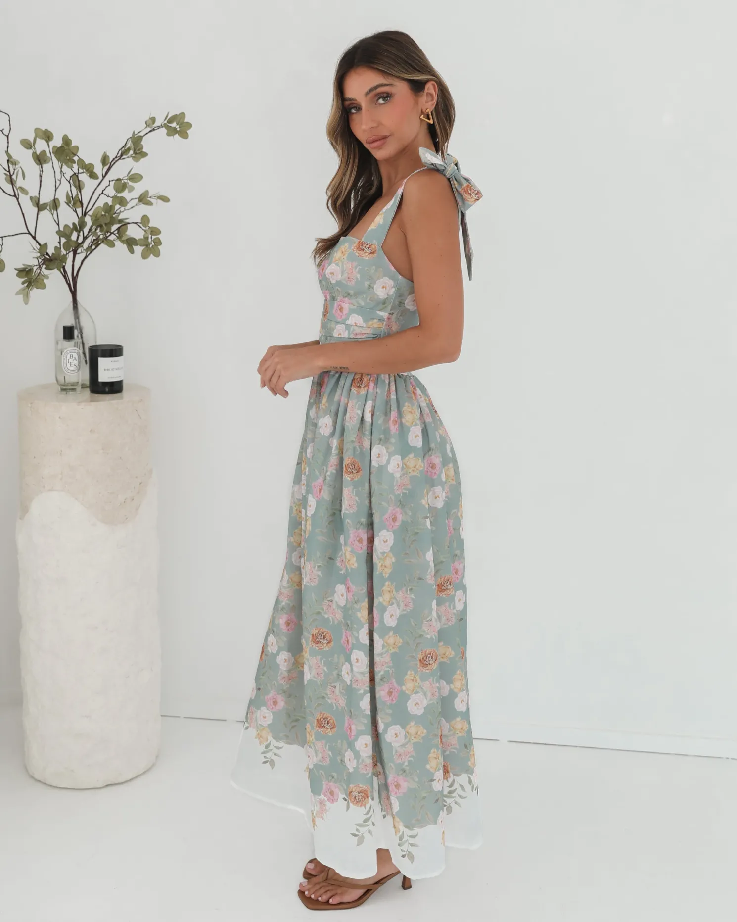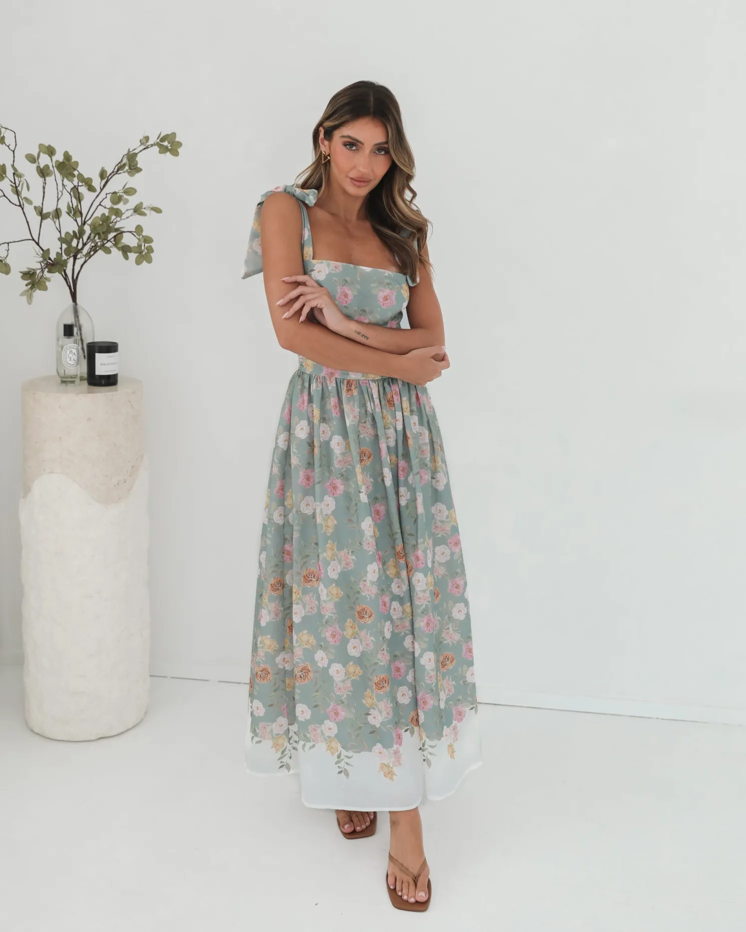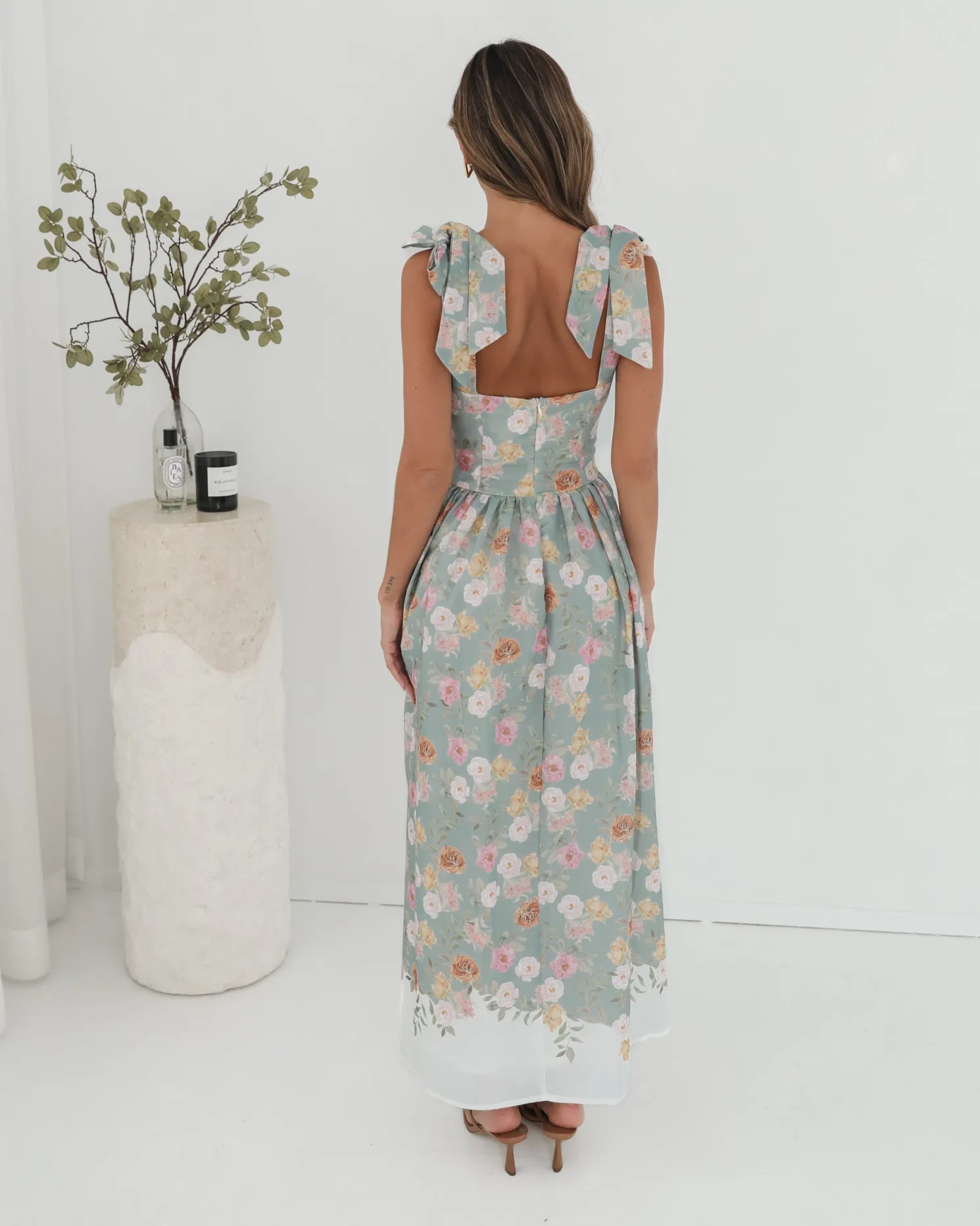 Our Zyrelise Dress comes in a mint base with multicoloured floral prints. Designed for the romantics at heart, this number features bow straps, square neckline, flowy skirt and maxi length hem. Look soft and dreamy with ballet flats and a pastel handbag!